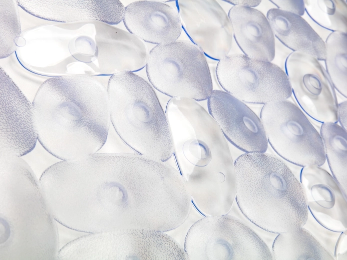 Dziesiątki przyssawek na spodzie utrzymują matę pewnie na miejscu i znacząco zmniejszają ryzyko poślizgnięcia na mokrej powierzchni.