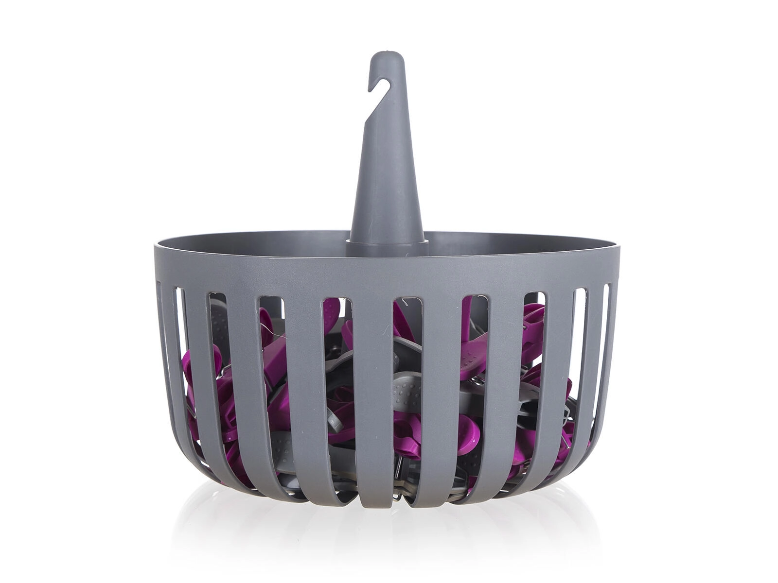 Praktyczny zestaw do codziennego suszenia prania: wiszący koszyk z haczykiem i 30 wytrzymałymi plastikowymi klamerkami w mieszance kolorów fioletowego i antracytowego. Koszyk można zawiesić bezpośrednio na sznurku, dzięki czemu klamerki masz zawsze pod ręką, a suszenie jest szybsze i wygodniejsze.