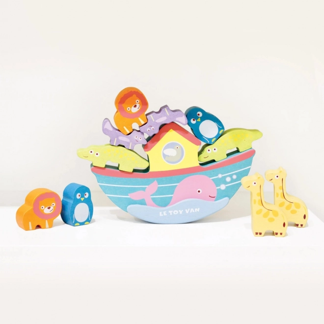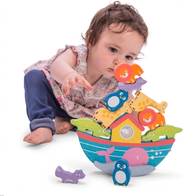 To pięknie kolorowa balansująca arka zawiera dziesięć ręcznie malowanych zwierzątek, które dzieci umieszczają na łódce, wzmacniając swoją koordynację ręka-oko i zręczność. Zestaw tych zwierzątek i łódki wykonany jest z odnawialnego drewna FSC i pomalowany jest nietoksycznymi farbami na bazie wody.