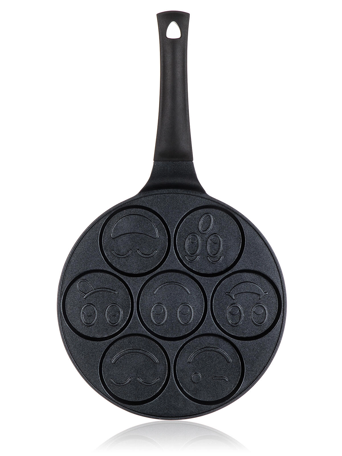 Odkryj zabawną patelnię do racuchów ALIVIA Smile o średnicy 26 cm z siedmioma formami o średnicy 8 cm. Dzięki nieprzywierającej powłoce przygotujesz racuchy, jajka sadzone i placki ziemniaczane bez przypalania. Patelnię można używać na wszystkich typach kuchenek, w tym indukcyjnych, a każda porcja zachwyci radosnymi dziecięcymi motywami.