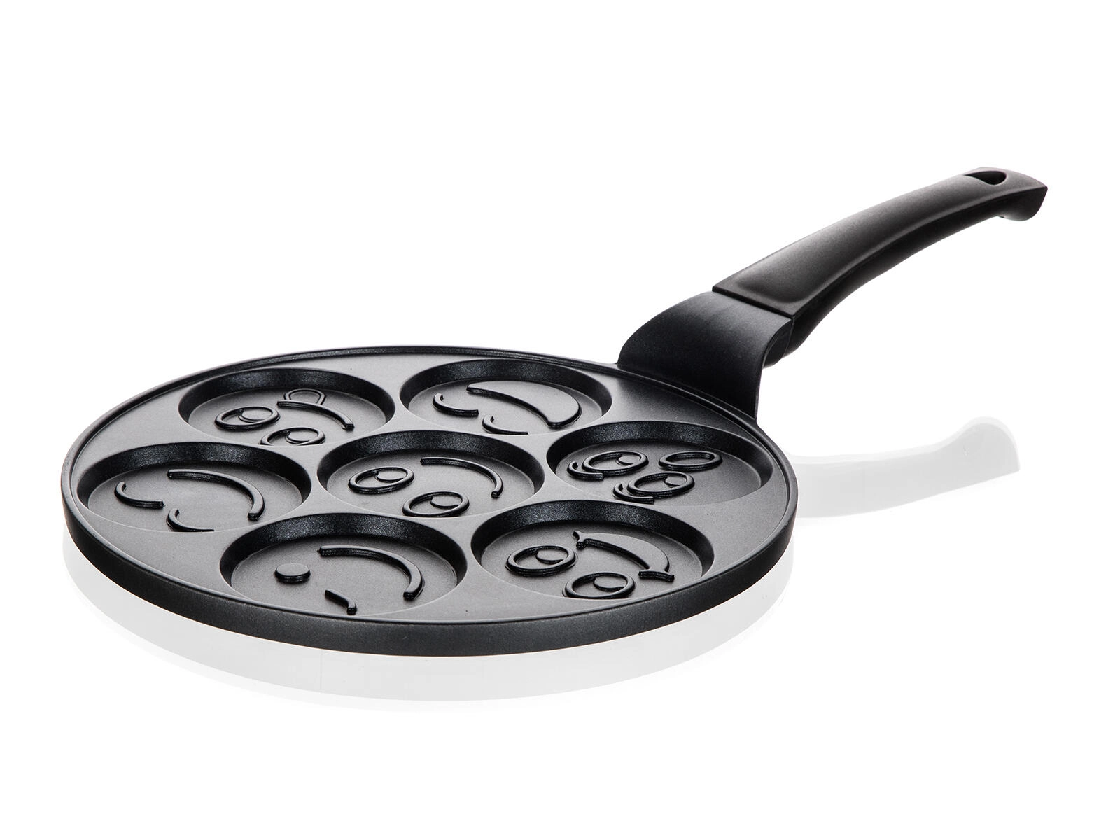 Patelnia do racuchów ALIVIA Smile zamieni każde śniadanie w świetną zabawę. Siedem okrągłych zagłębień o średnicy 8 cm z reliefowymi wzorami gwarantuje idealnie uformowane racuchy i jajka z uśmiechem. Odlewane aluminium zapewnia szybkie i równomierne nagrzewanie, a wysokiej jakości nieprzywierająca powłoka ułatwia obracanie i czyszczenie.