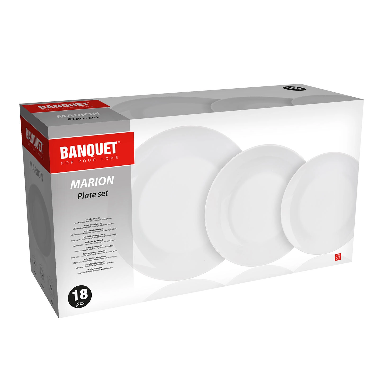 - Komplet dla 6 osób: 6× talerz deserowy, 6× talerz płytki, 6× talerz głęboki
