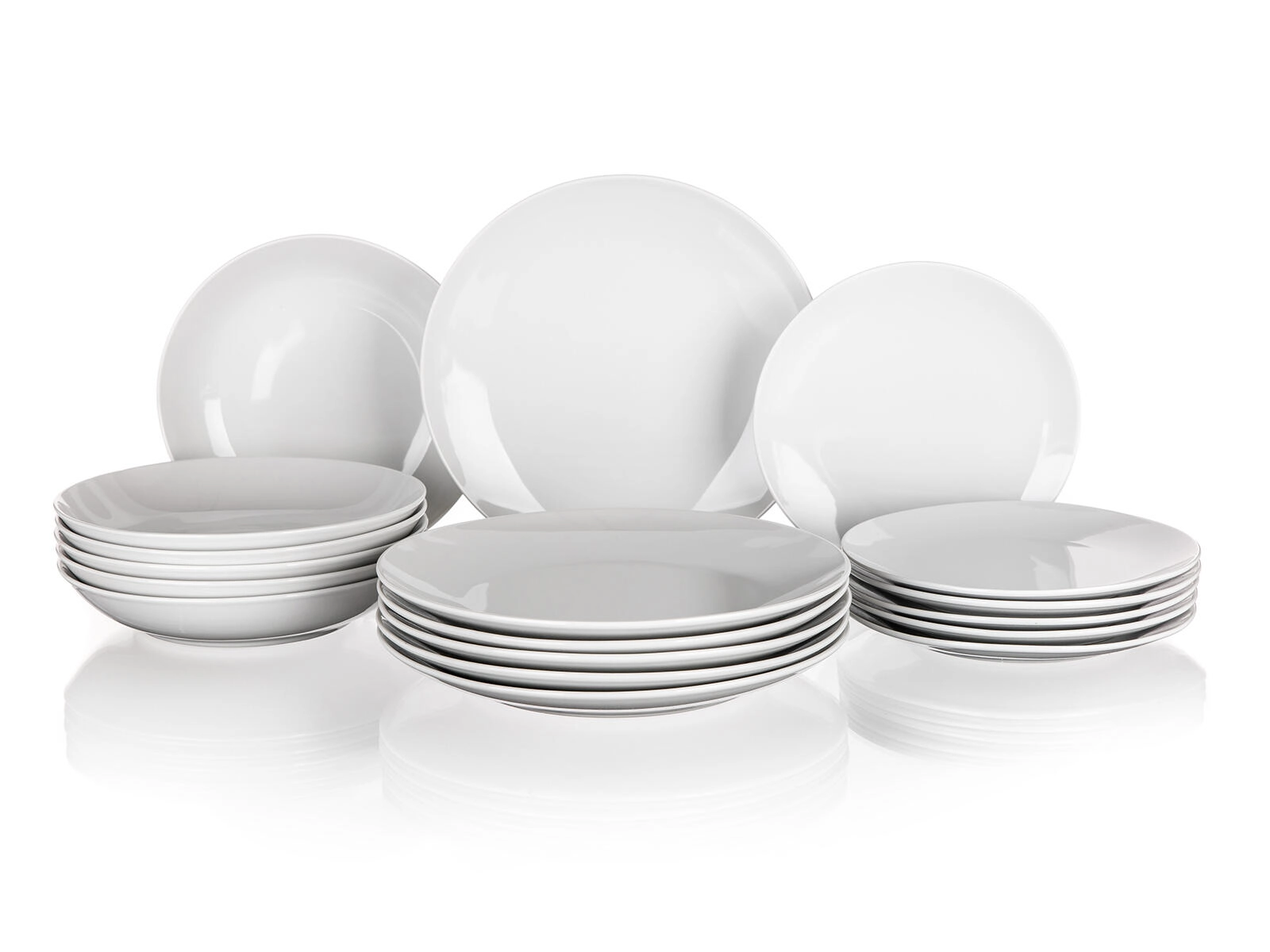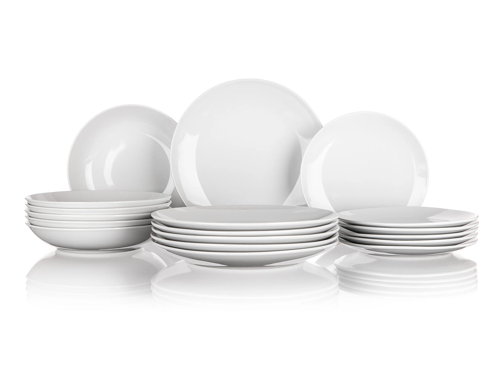 - 6× talerz deserowy 19 cm, 6× talerz głęboki 21,5 cm, 6× talerz płytki 24 cm