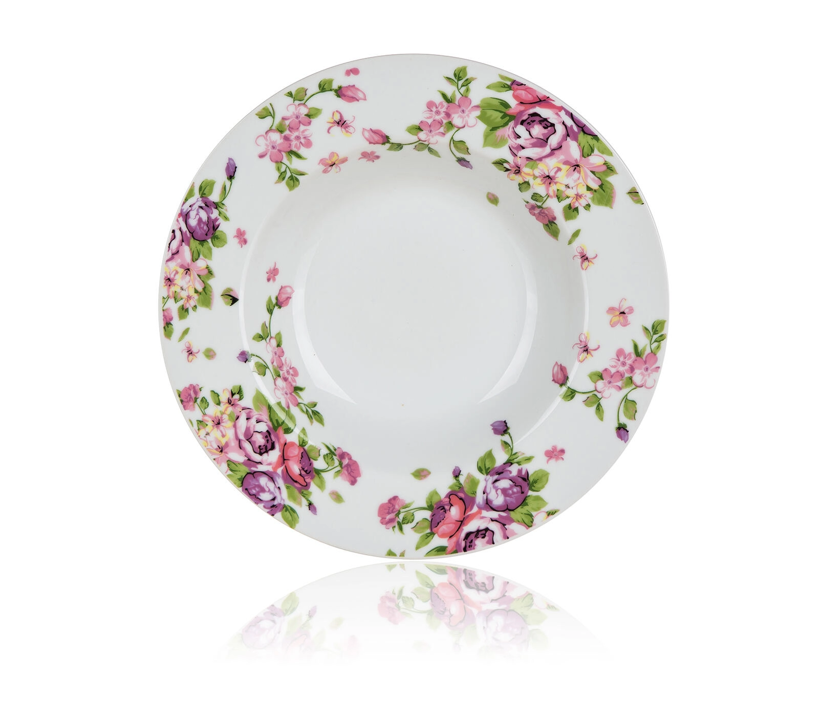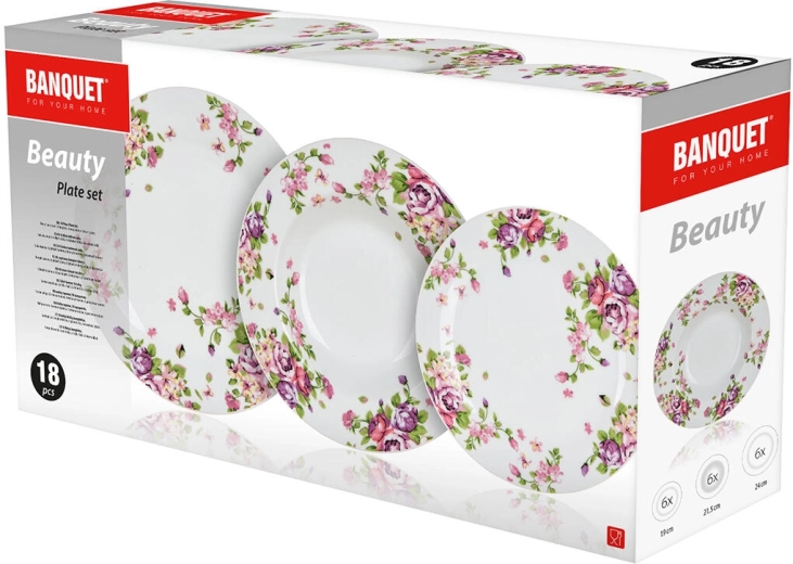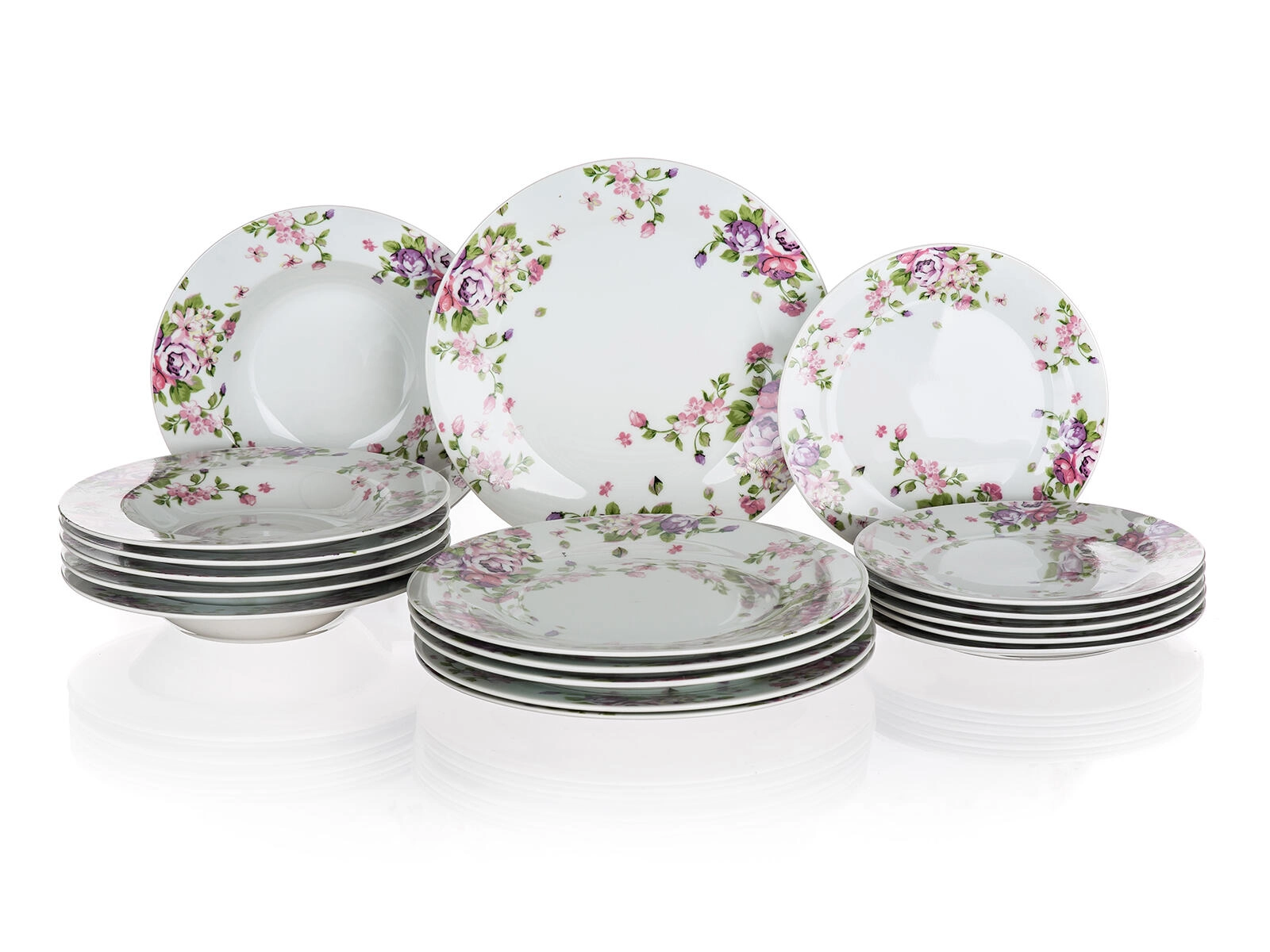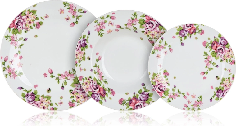 Elegancki porcelanowy zestaw obiadowy Beauty z kwiatowym dekorem wnosi harmonię na każdy stół. Zawiera 18 elementów dla 6 osób: talerze deserowe, płytkie i głębokie. Dzięki wysokiej jakości porcelanie nadaje się do zmywarki i kuchenki mikrofalowej, ma błyszczącą glazurę oraz spójny design do stylowego serwowania na co dzień i od święta.