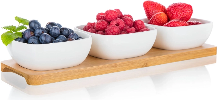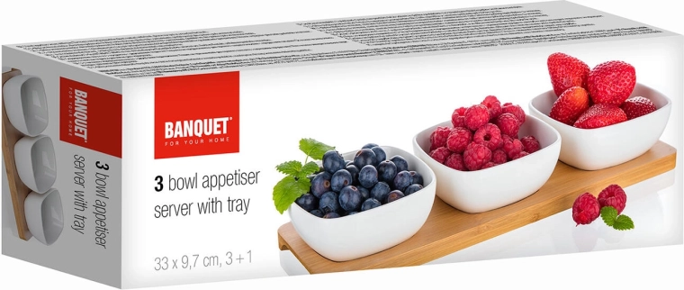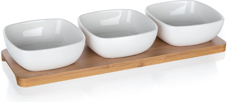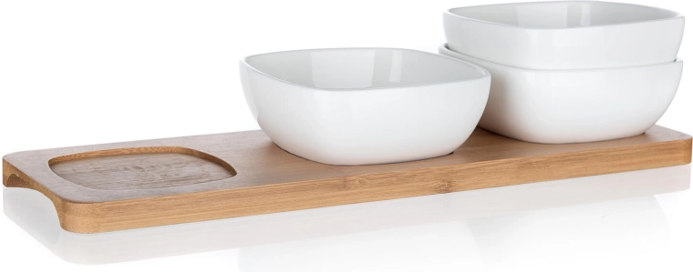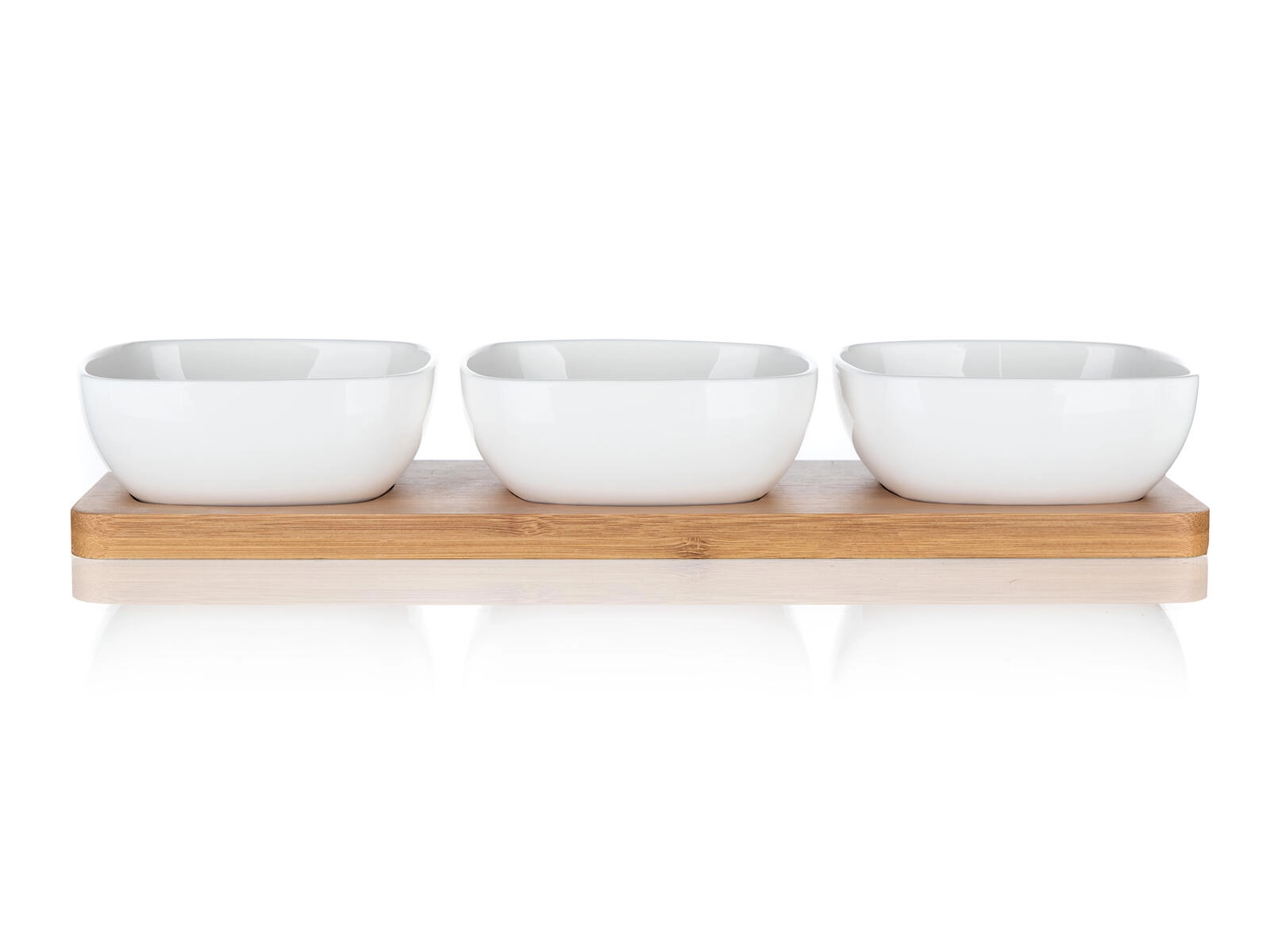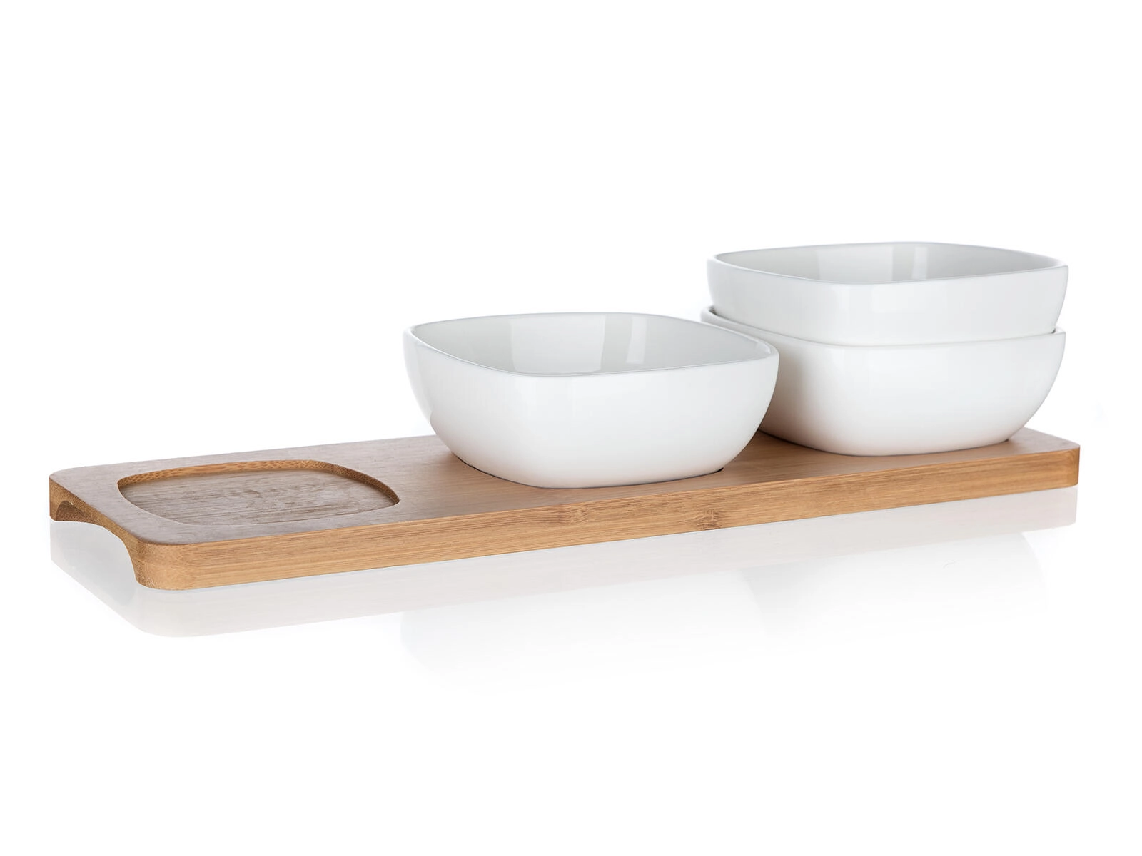 Ten kompaktowy zestaw trzech kwadratowych miseczek z wysokiej jakości porcelany na solidnej bambusowej tacy oferuje praktyczne i estetyczne rozwiązanie zarówno do codziennego serwowania, jak i odświętnych przyjęć. Błyszcząca porcelana podkreśla kolory serwowanych przysmaków, a naturalny bambus nadaje serwowaniu ciepły, nowoczesny akcent.