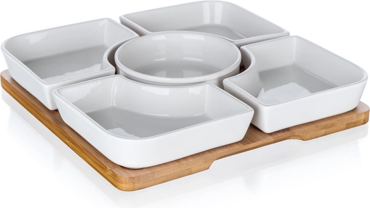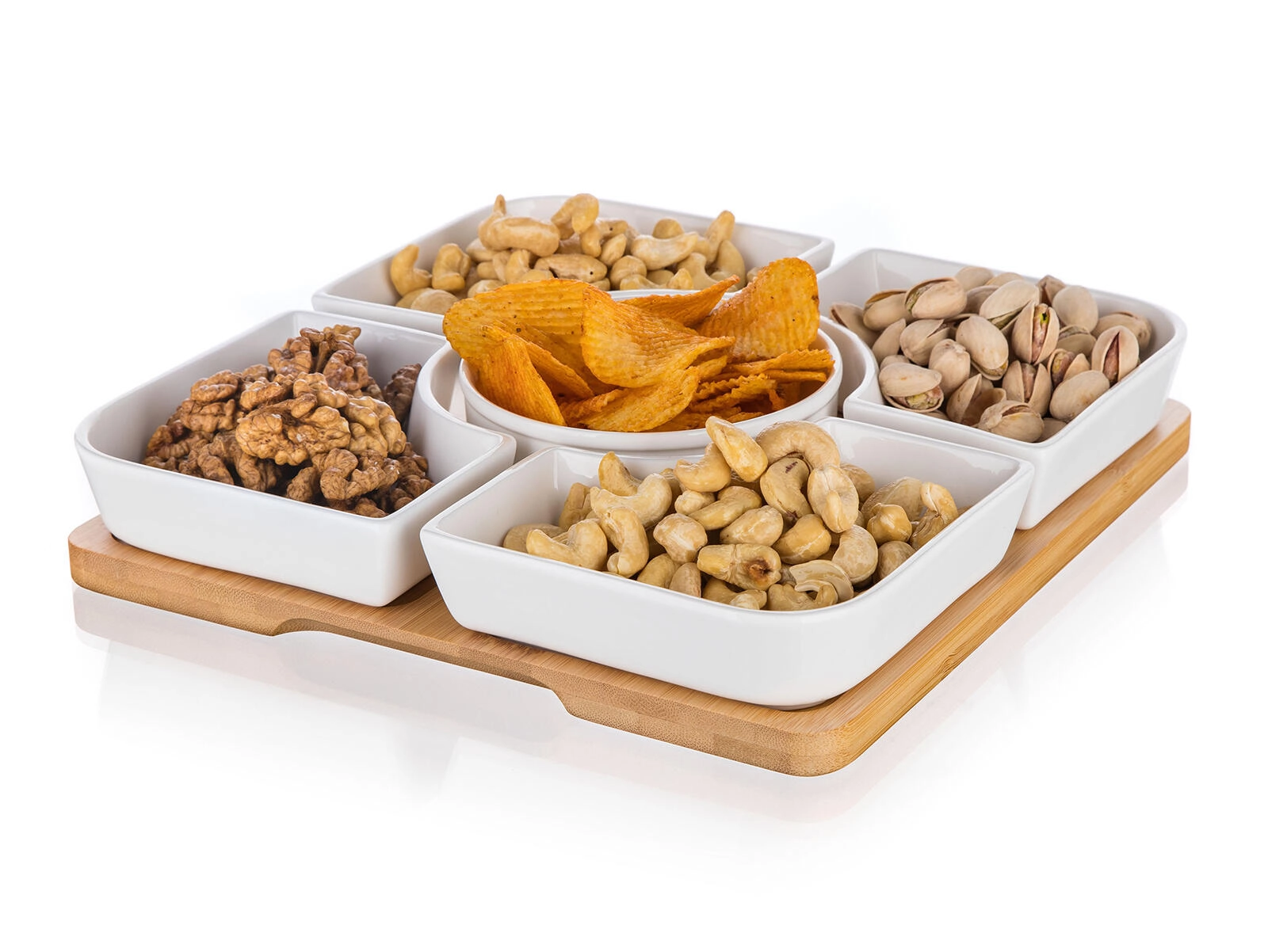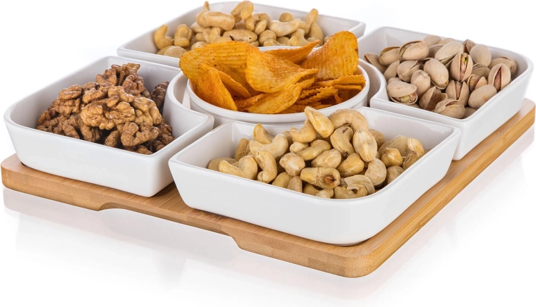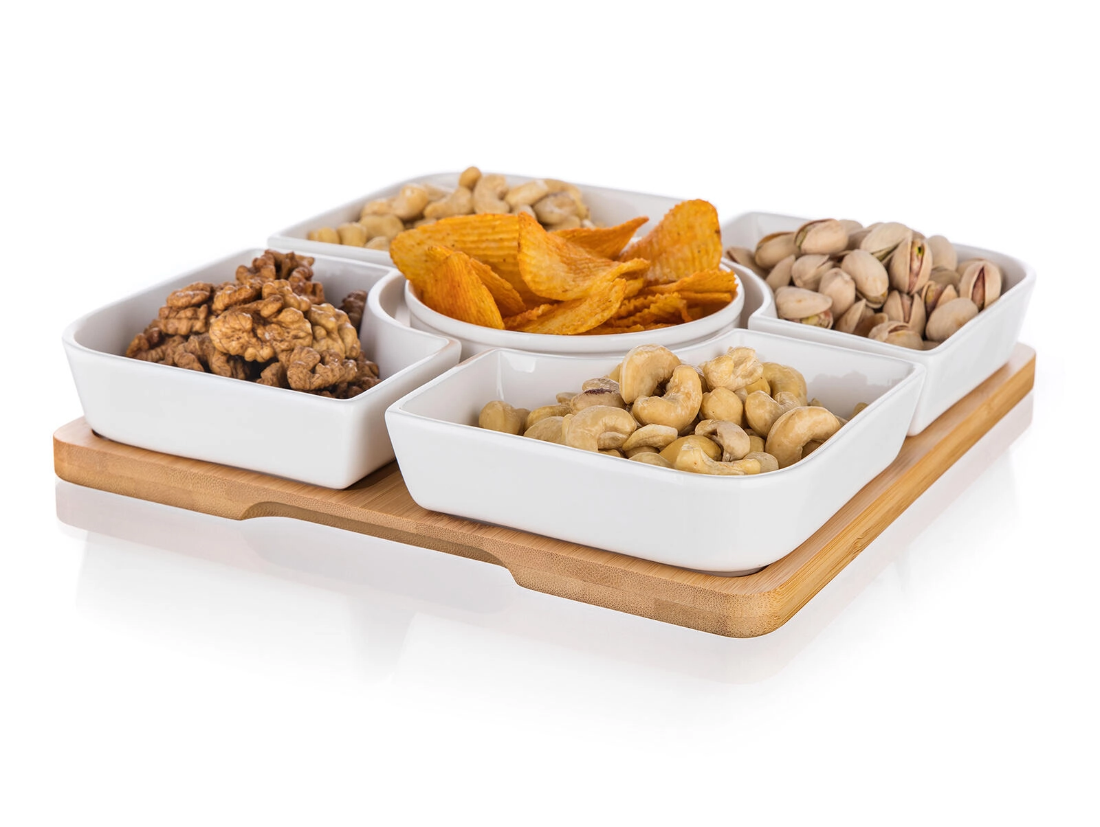 Cztery kwadratowe miseczki oraz centralna okrągła miseczka na bambusowej tacy zapewniają przejrzysty podział przekąsek i apetyczną prezentację na stole.
