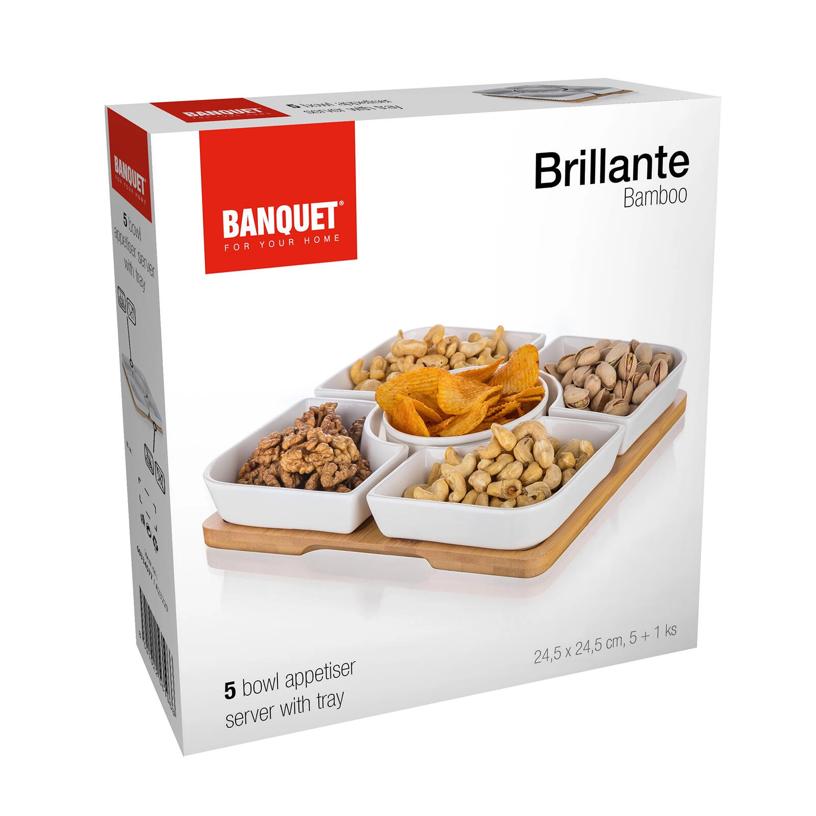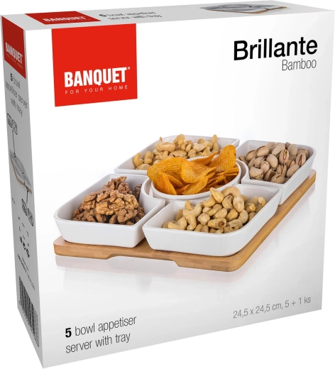 Udoskonal swoje nakrycie stołu dzięki praktycznemu i designerskiemu zestawowi do serwowania BRILLANTE. Pięć białych porcelanowych miseczek (cztery kwadratowe i jedna okrągła pośrodku) umieszczono na solidnej bambusowej tacy. Zestaw oferuje przejrzysty podział przekąsek i doskonale sprawdzi się na rodzinnych przyjęciach, spotkaniach ze znajomymi oraz w codziennym serwowaniu.