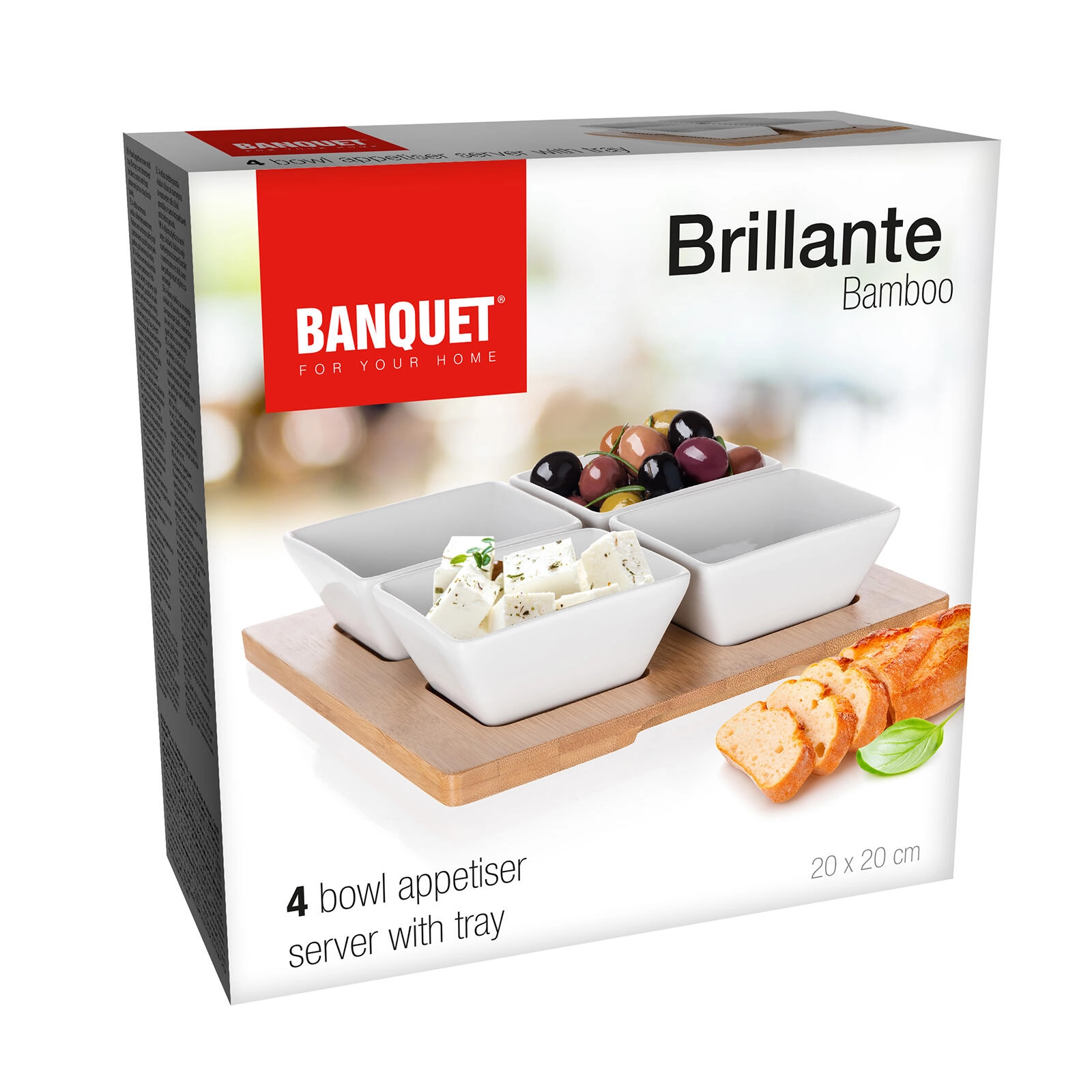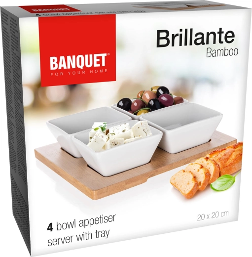 Elegancki zestaw do serwowania BRILLANTE łączy porcelanowe miseczki i bambusową tacę dla stylowego podawania oliwek, orzechów, dipów i sosów. Kompaktowy wymiar 20 × 20 cm oszczędza miejsce, a gładka glazura i naturalny bambus nadają nowoczesny wygląd każdemu nakryciu stołu.