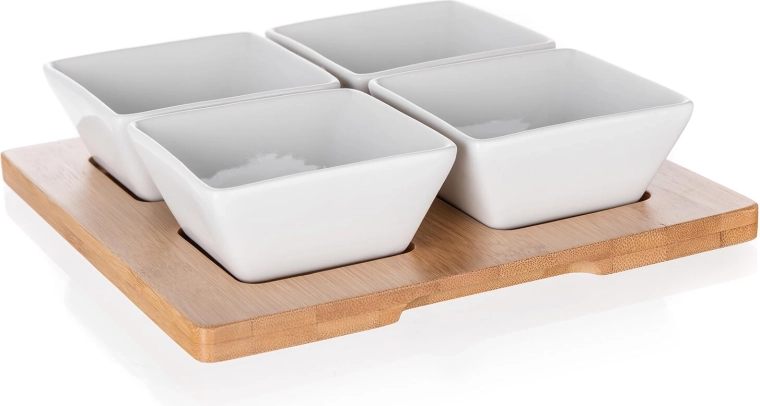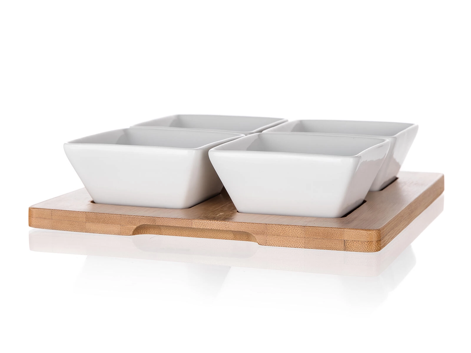 Ten 5‑częściowy zestaw do serwowania łączy minimalistyczny design z funkcjonalnością. Cztery porcelanowe miseczki o wymiarach 8 × 8 × 4 cm osadzone są w stabilnej bambusowej tacy, która ułatwia przenoszenie i utrzymuje miseczki na miejscu. Idealny do podawania drobnych przekąsek, tapas, dipów i przypraw.