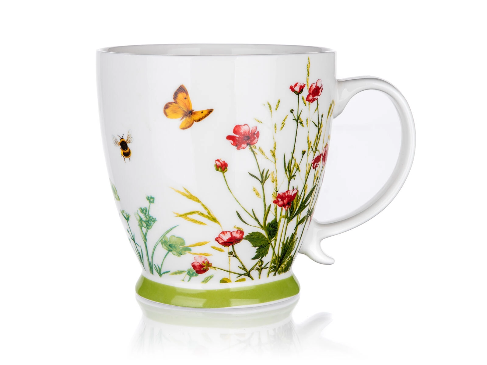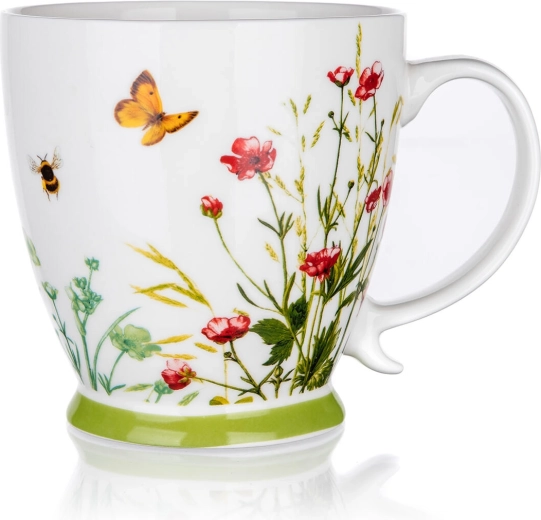 Odkryj urok natury przy swoim stole z kubkiem MEADOW o pojemności 450 ml. Biała baza z kolorowym łąkowym wzorem – kwiaty, motyl i pszczoła – wprowadza przyjemną atmosferę do codziennego picia herbaty lub kawy. Praktyczne ucho gwarantuje wygodny chwyt, a wysokiej jakości glazura nadaje połysk i trwałość.