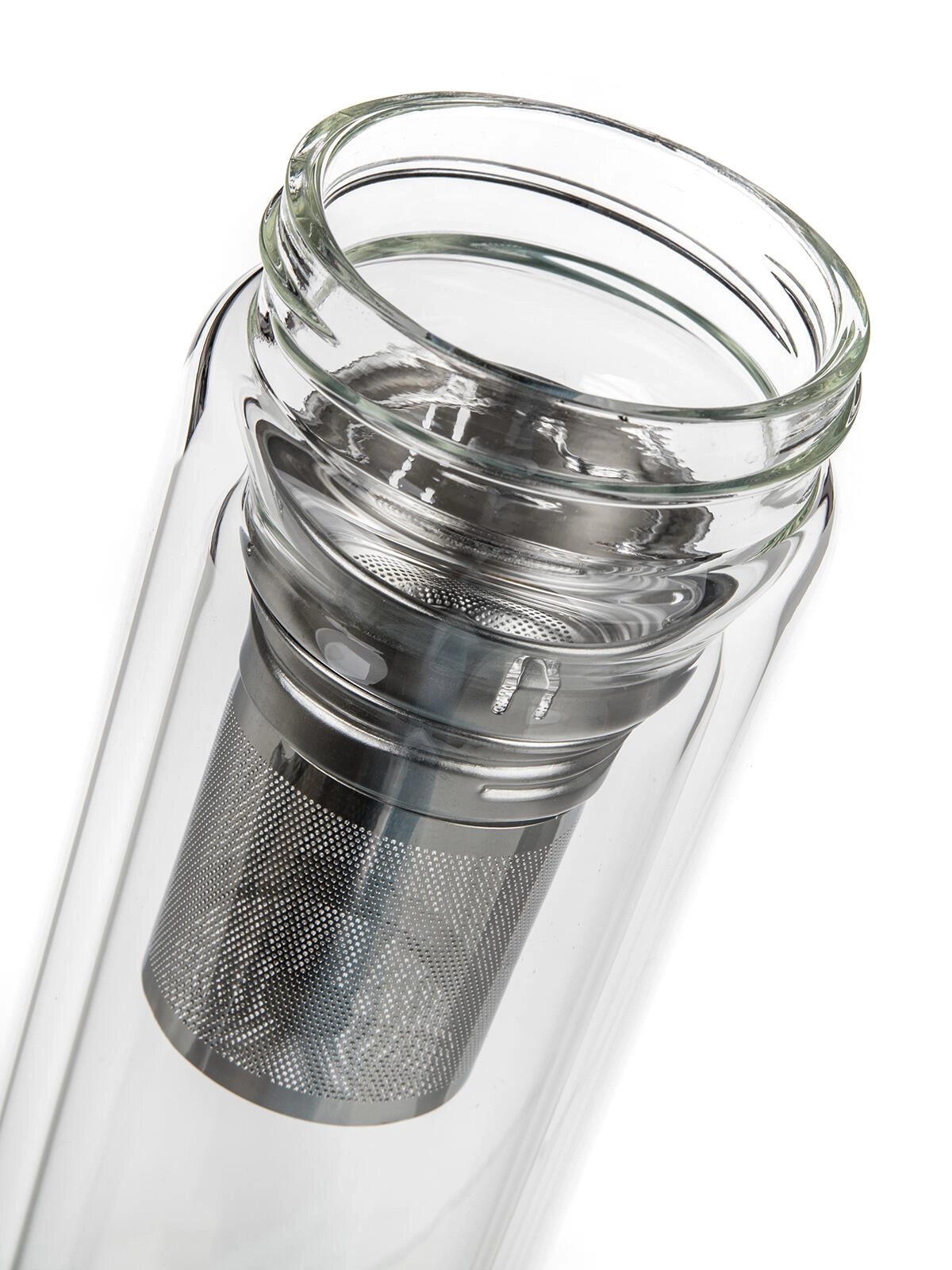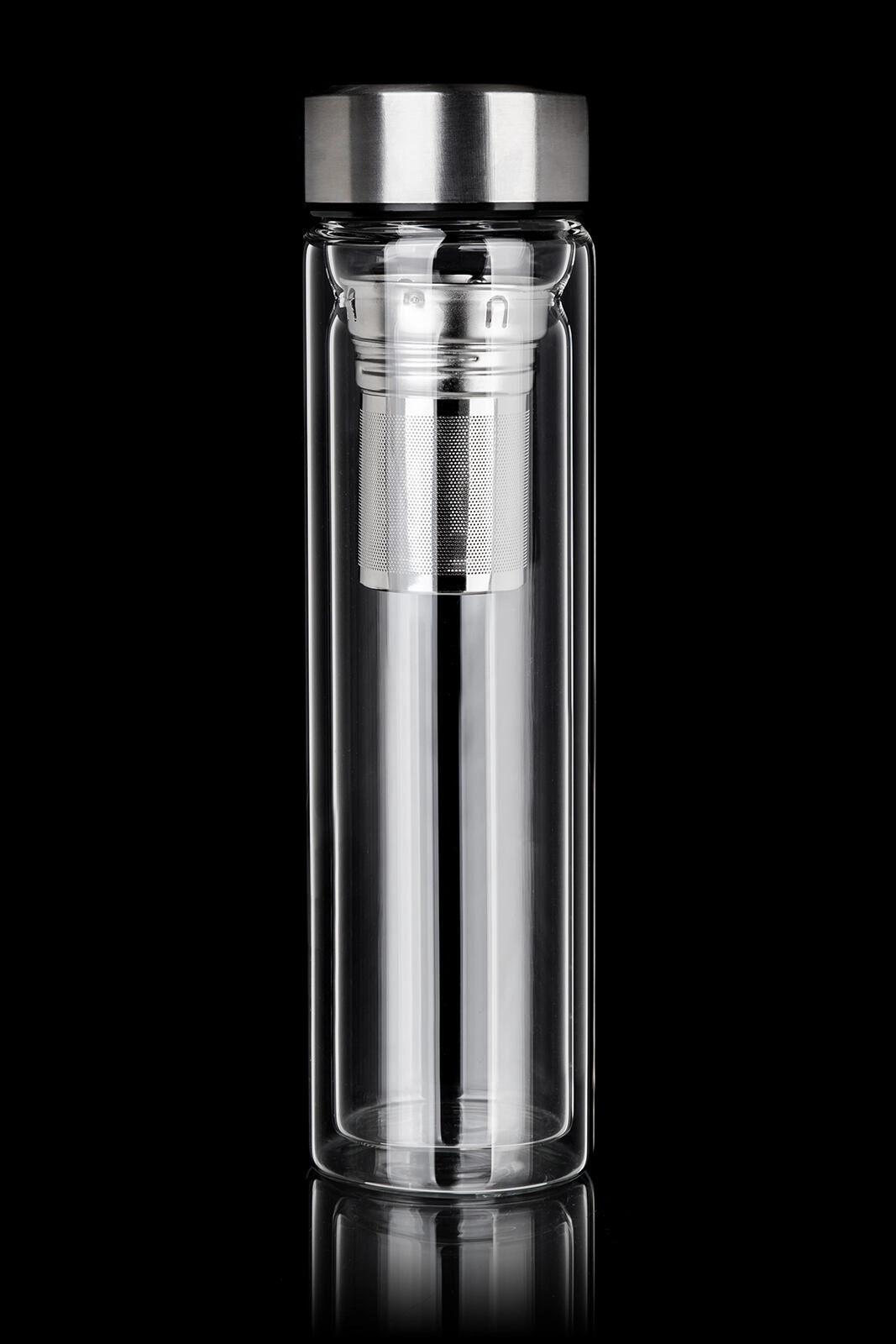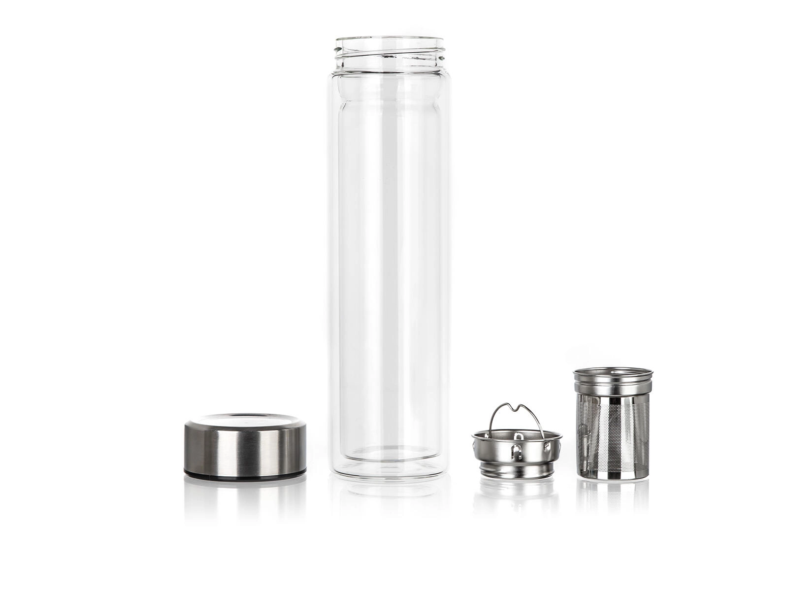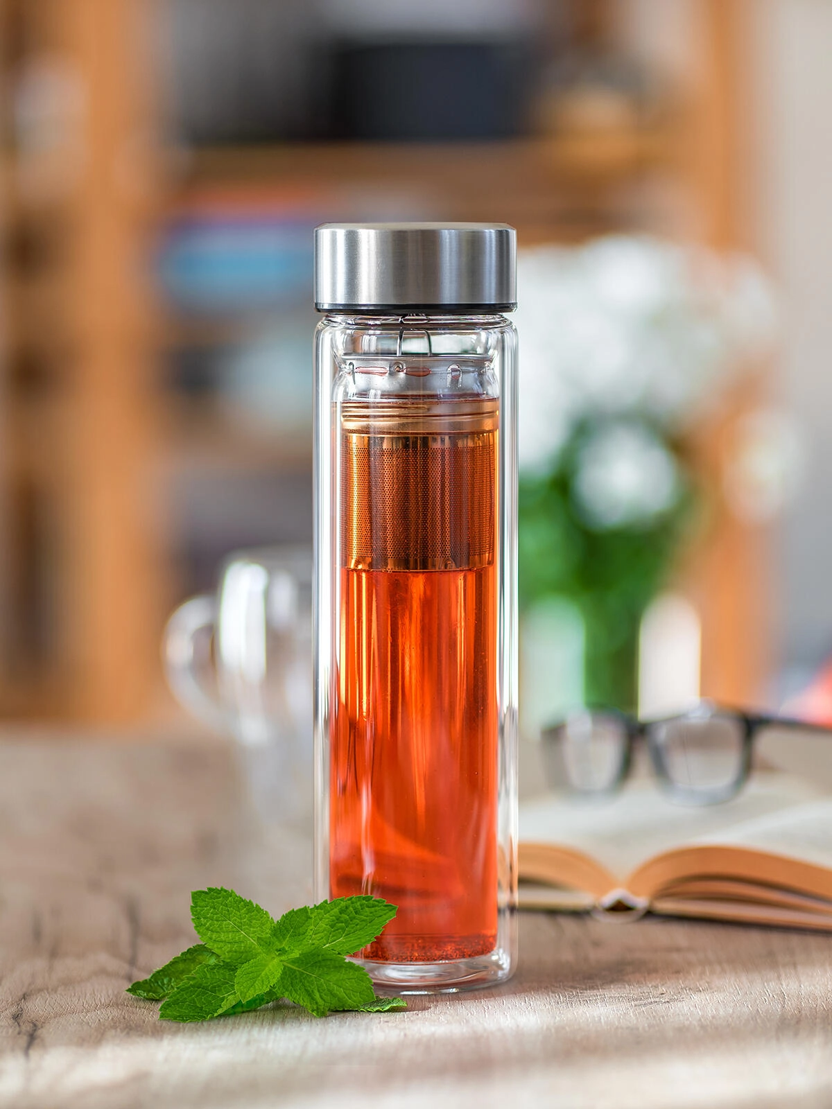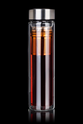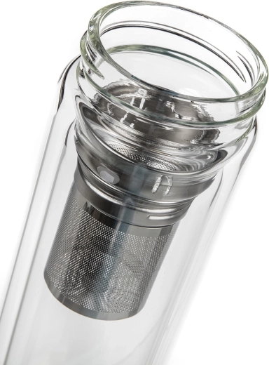 W zestawie znajduje się wyjmowane, drobne sitko ze stali nierdzewnej, które umożliwia wygodne parzenie herbaty liściastej lub przygotowanie naparów z ziół i owoców bezpośrednio w butelce. Wieczko ze stali nierdzewnej 18/8 gwarantuje higienę, trwałość i bezpieczne zamknięcie. Czysty, nowoczesny design z przezroczystego szkła dodatkowo podkreśla kolor napoju.