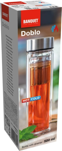 Ciesz się ulubionym napojem zawsze i wszędzie. Butelka DOBLO wykonana jest ze szkła borokrzemowego odpornego na wysokie temperatury i szoki termiczne. Podwójna ścianka minimalizuje przenoszenie ciepła na powierzchnię, dzięki czemu butelkę wygodnie się trzyma, a napój dłużej utrzymuje idealną temperaturę — niezależnie od tego, czy jest to gorąca herbata, czy orzeźwiająca woda z owocami.