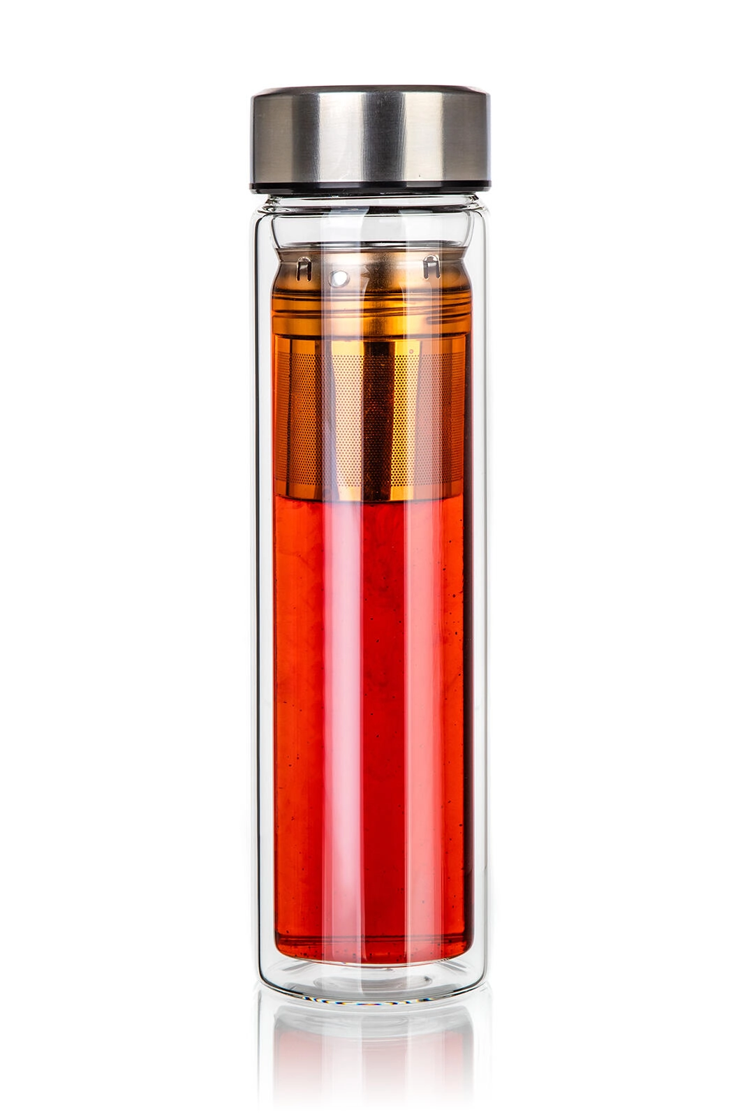 Zintegrowane stalowe sitko umożliwia łatwe parzenie herbaty liściastej, ziół lub przygotowanie owocowych naparów bezpośrednio w butelce.