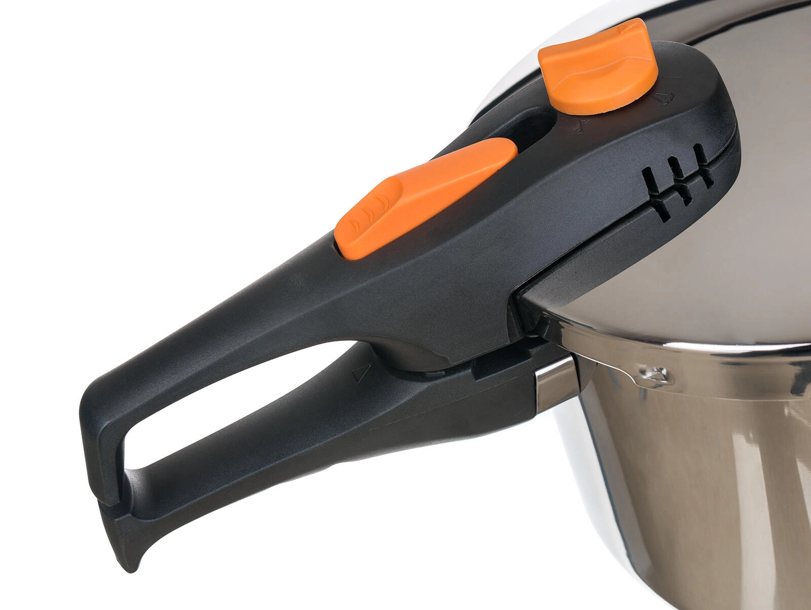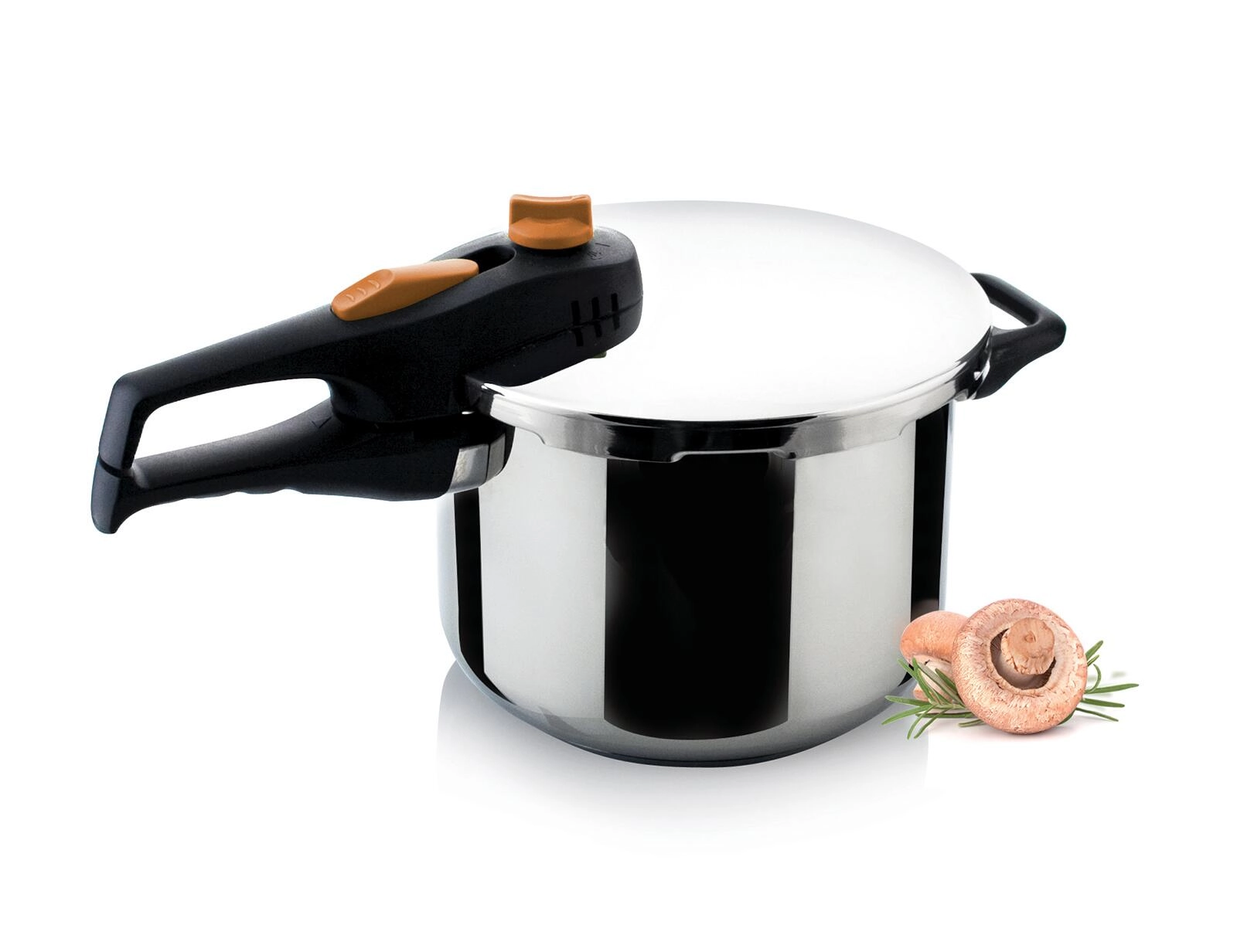 Pokrywa z zaworem roboczym, blokadą przed otwarciem i ergonomicznym pomarańczowym pokrętłem umożliwia pewne zamknięcie i wygodne odprowadzanie pary.