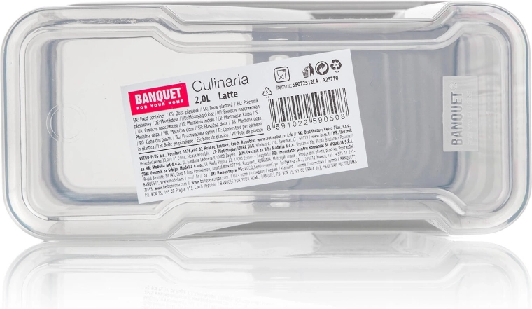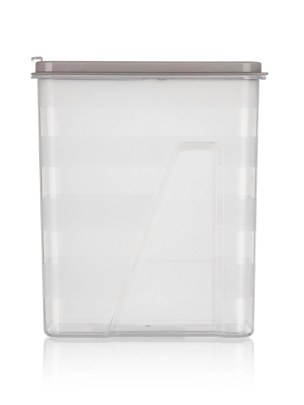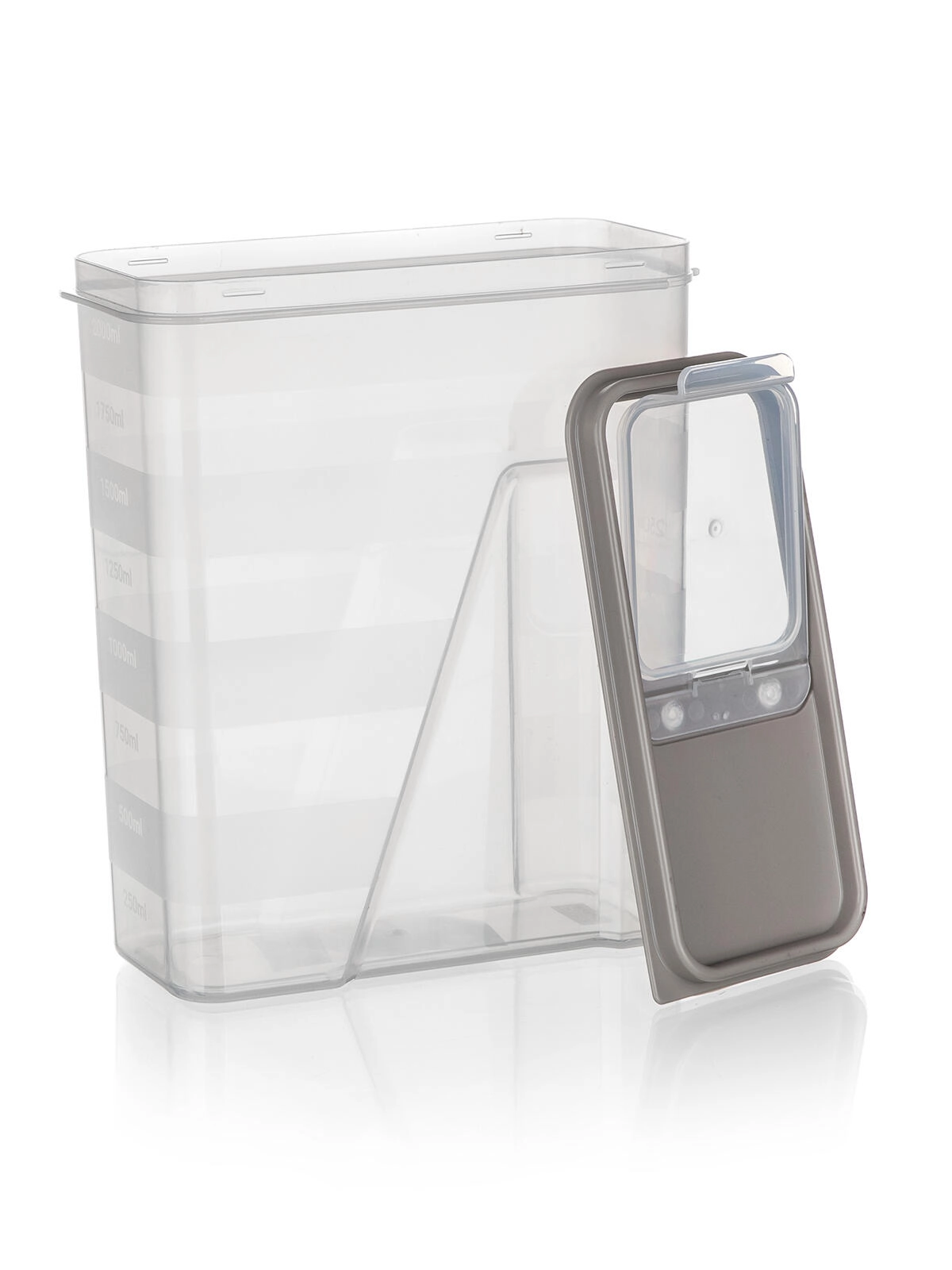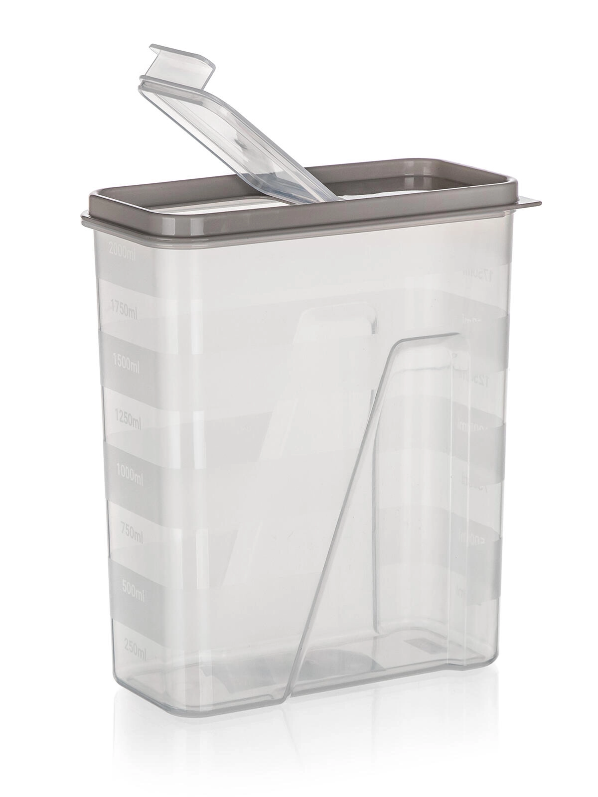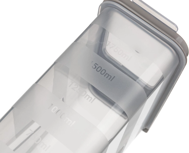 Ten przezroczysty plastikowy pojemnik 2 l jest idealny do przechowywania makaronu, roślin strączkowych, ryżu, mąki i płatków śniadaniowych. Dzięki przezroczystemu korpusowi zawsze widzisz zawartość, a zintegrowana podziałka co 250 ml pomaga precyzyjnie odmierzyć potrzebną ilość.