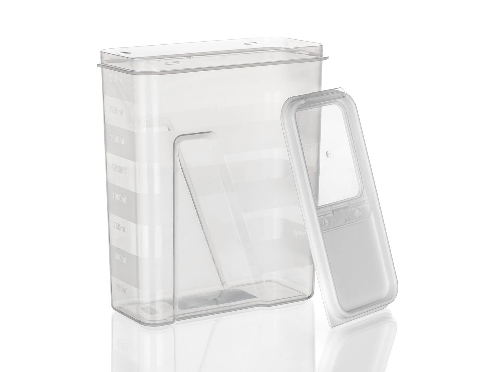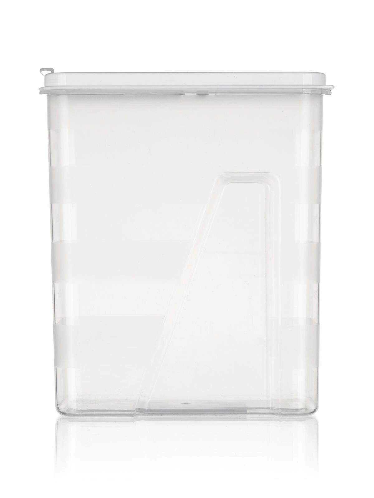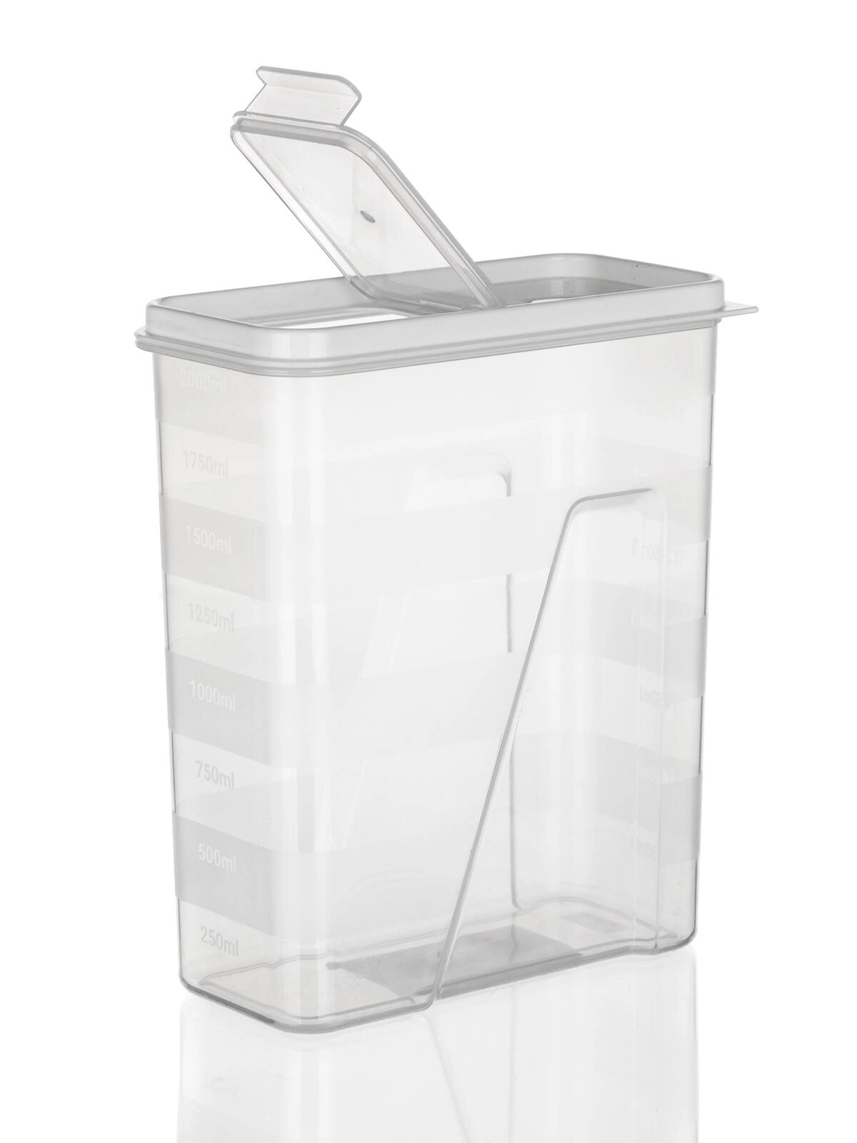 Ten pojemny, 2‑litrowy pojemnik jest idealny do codziennej organizacji spiżarni. Przezroczyste ścianki umożliwiają szybką kontrolę wzrokową zawartości, a biała pokrywka z praktycznym otwieraniem sprawia, że żywność dłużej pozostaje świeża i chroniona przed wilgocią.