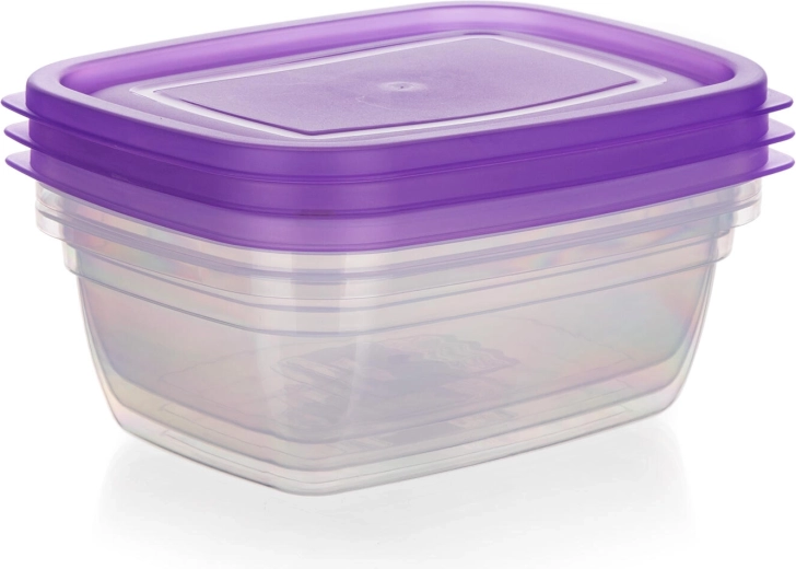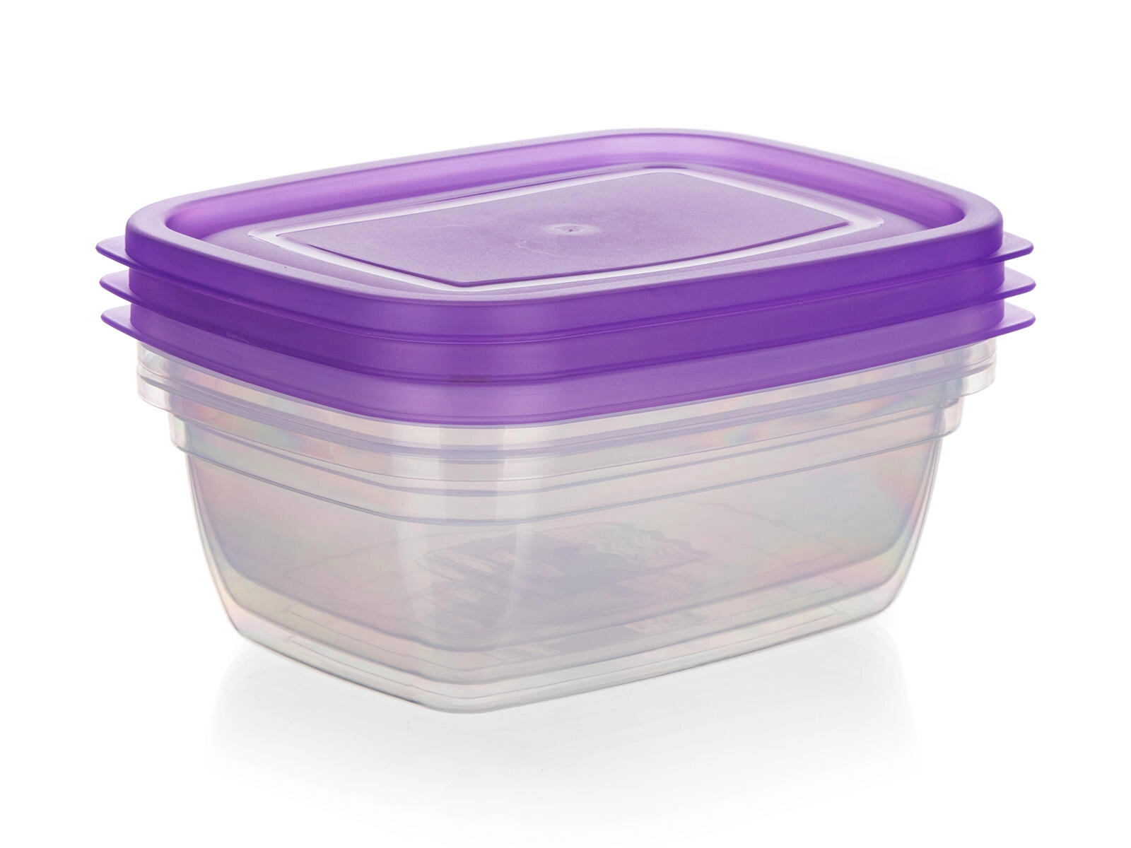 Praktyczny zestaw trzech kuchennych pojemników o pojemności 1,25 l do przejrzystego przechowywania żywności. Dzięki transparentnemu wykonaniu zawsze widzisz zawartość, a ściśle przylegające fioletowe wieczka pomagają utrzymać świeżość i zapobiegać wylaniom. Pojemniki są lekkie, wielokrotnego użytku i łatwo się piętrują, dzięki czemu oszczędzają miejsce w kuchni.