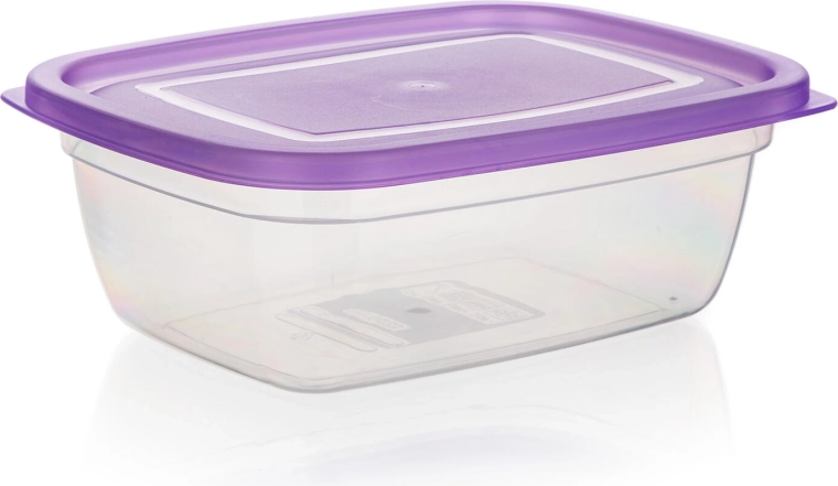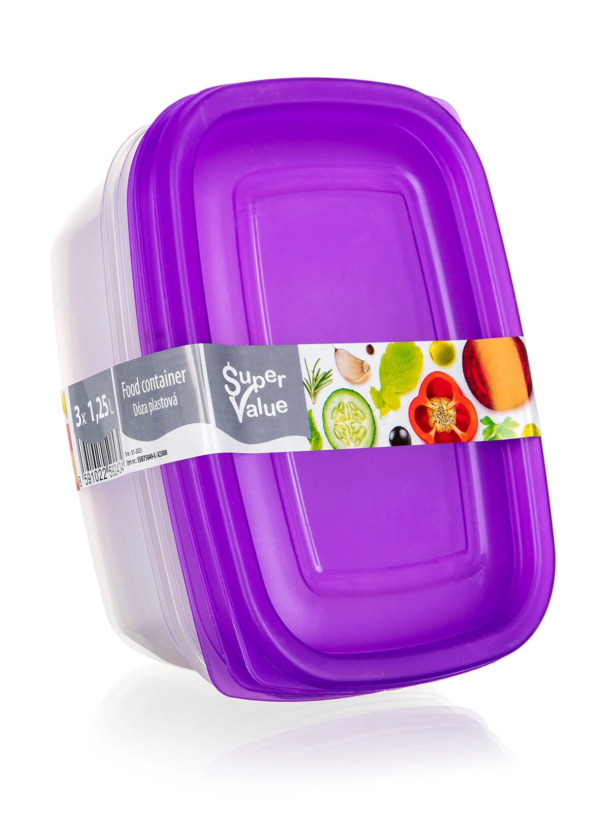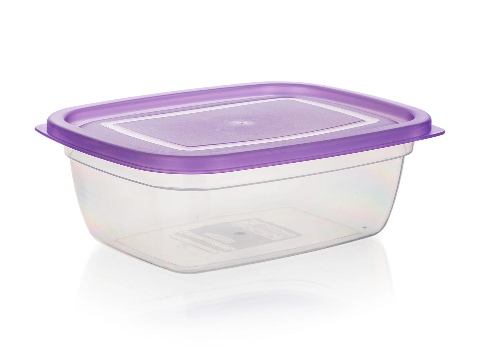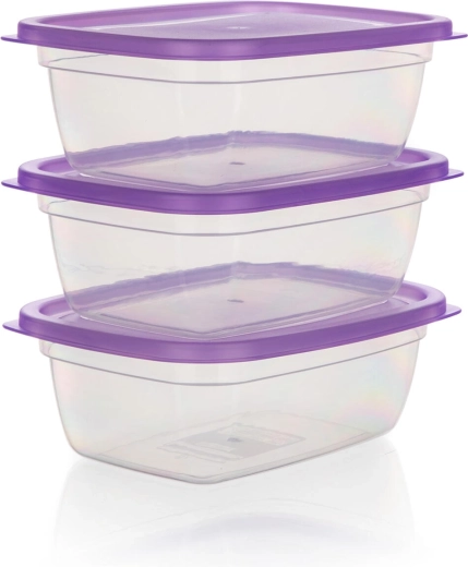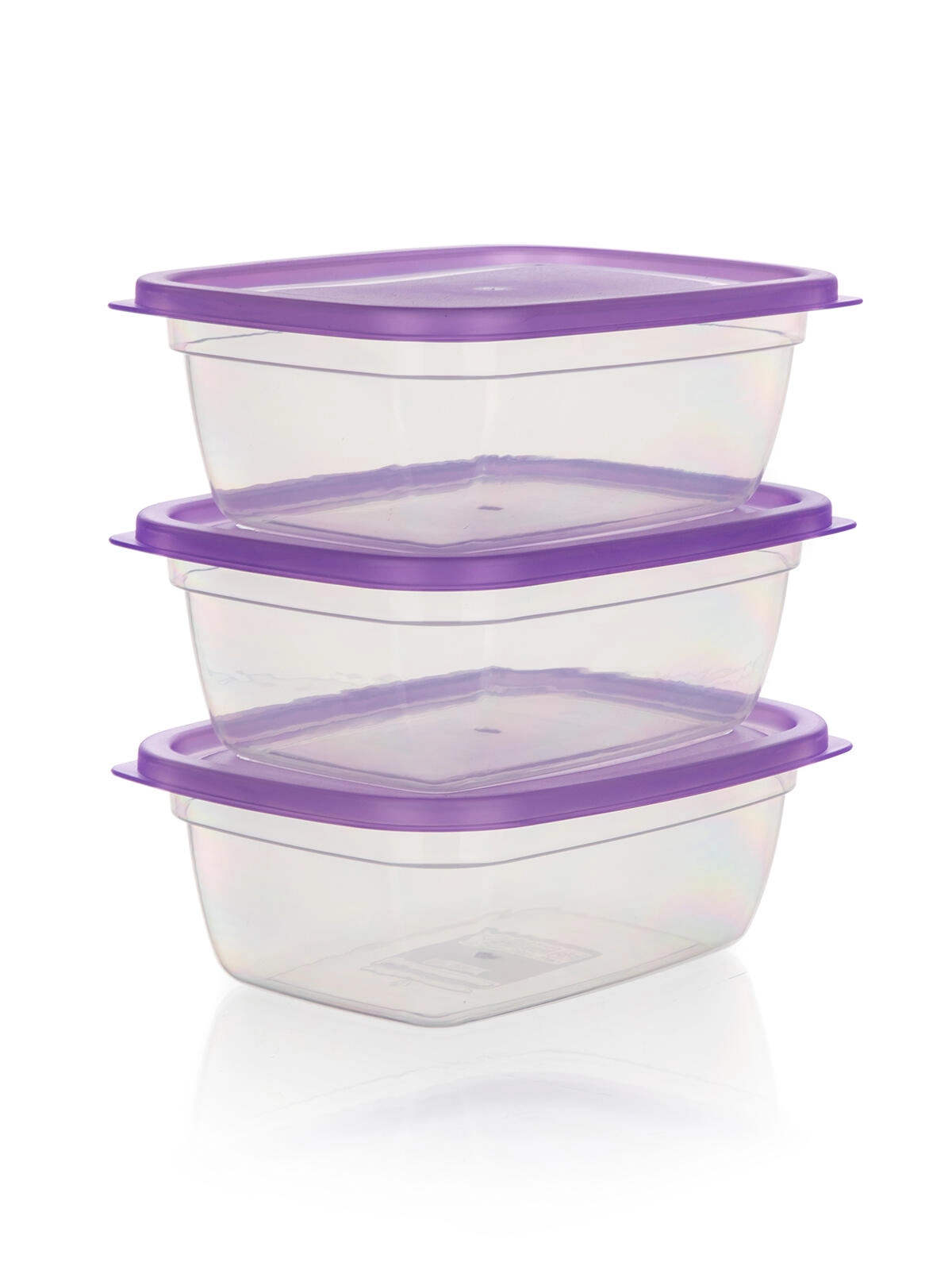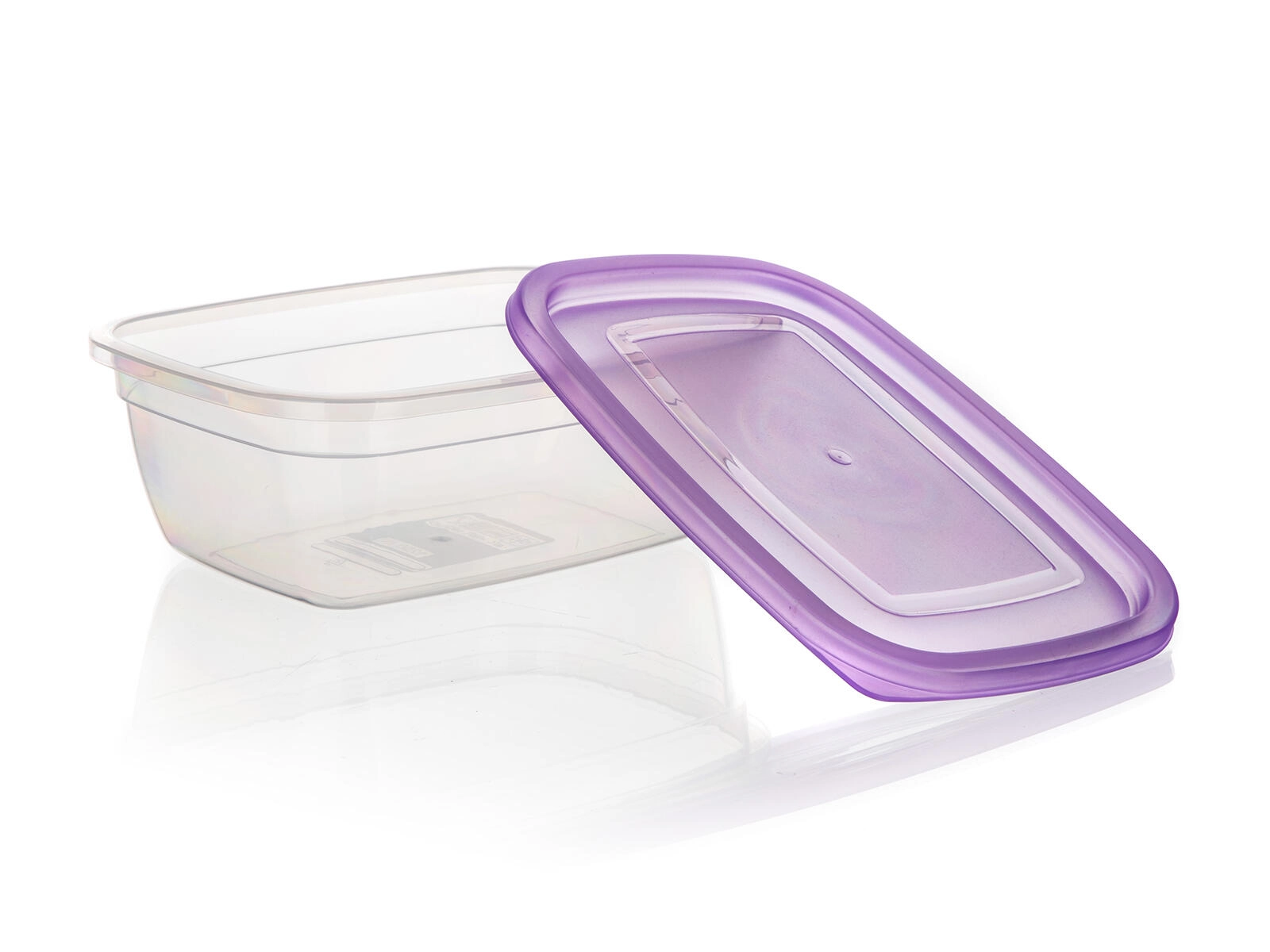 Utrzymaj porządek w lodówce i spiżarni z zestawem trzech prostokątnych pojemników na żywność o pojemności 1,25 l. Przezroczyste ścianki umożliwiają natychmiastową kontrolę zawartości, a solidne fioletowe wieczka z niezawodnym zatrzaskowym zamknięciem pomagają dłużej zachować świeżość żywności i bezpiecznie ją zamknąć.