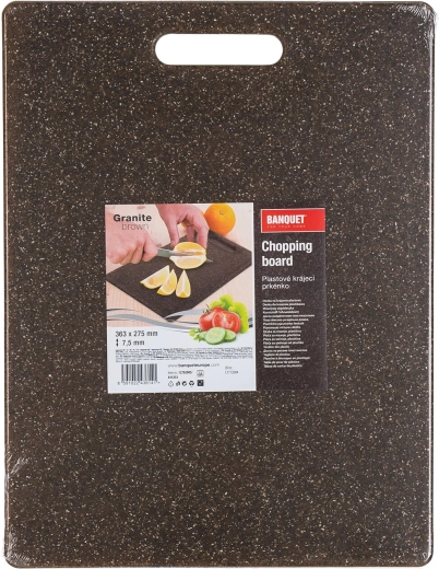 Praktyczna deska do krojenia Granite w ciemnobrązowym wykończeniu łączy nowoczesny wygląd z wysoką trwałością. Nie pochłania zapachów, łatwo ją utrzymać w czystości, a dzięki zintegrowanemu otworowi wygodnie ją przeniesiesz lub zawiesisz.