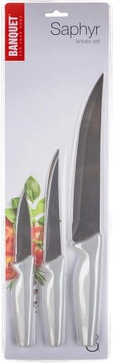Ten uniwersalny zestaw noży SAPHYR to idealny wybór do każdej kuchni. Zawiera trzy najczęściej używane typy noży z starannie wyważonymi stalowymi ostrzami, które ułatwiają bezpieczne i wygodne krojenie. Dzięki ergonomicznym szarym rękojeściom noże dobrze leżą w dłoni i ułatwiają pracę nawet podczas dłuższego użytkowania.
