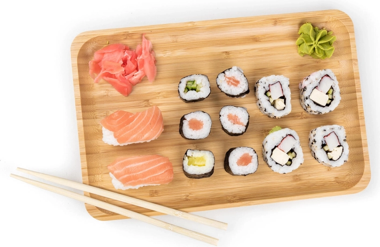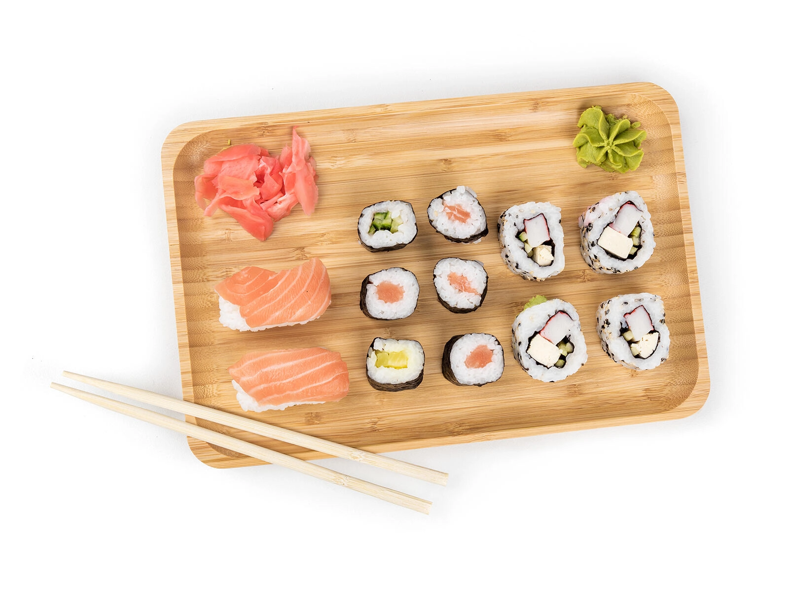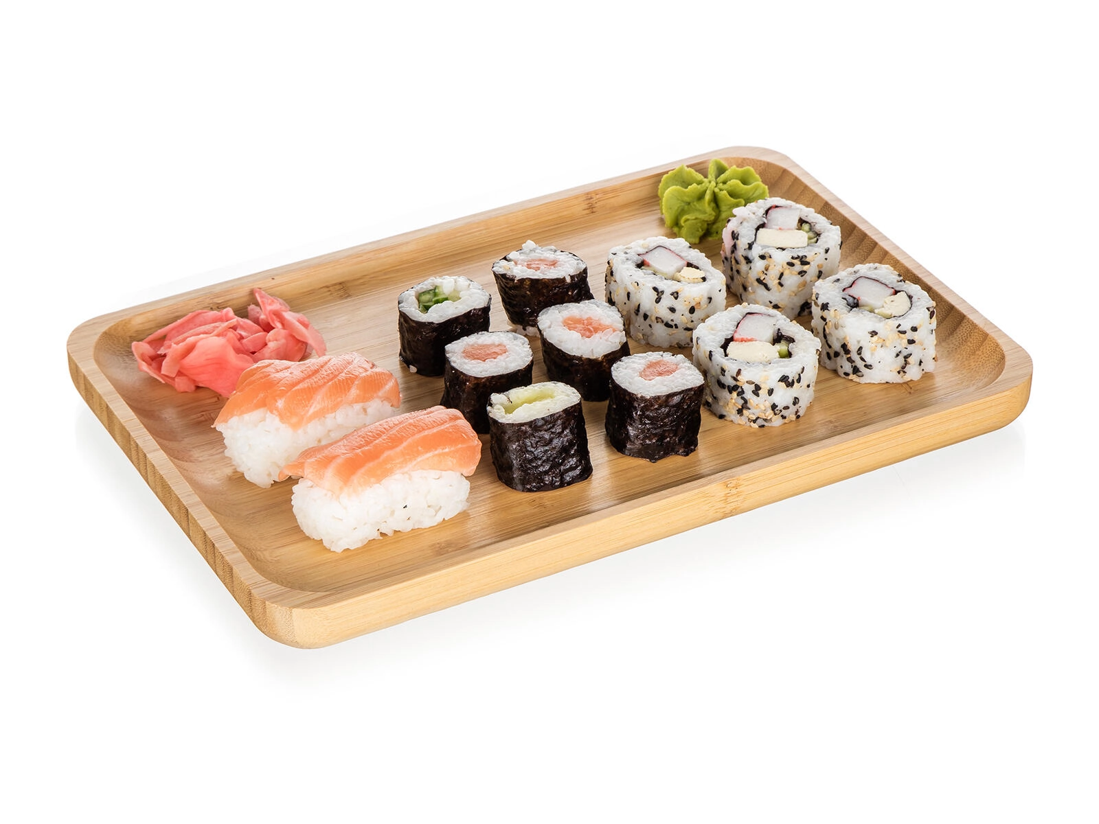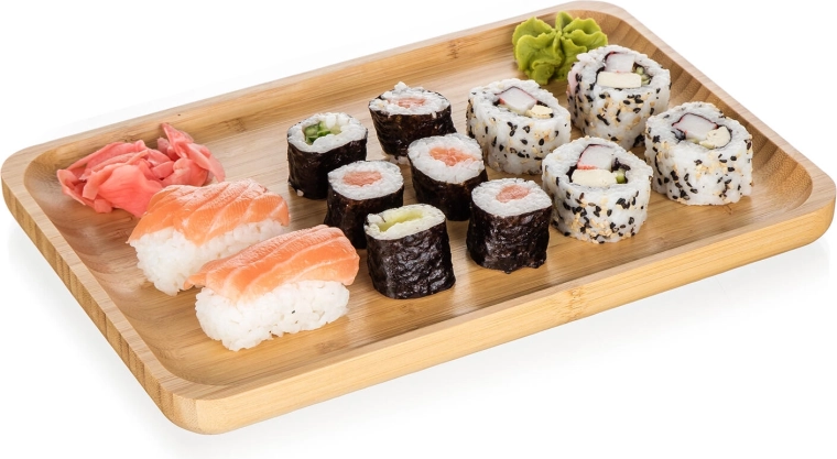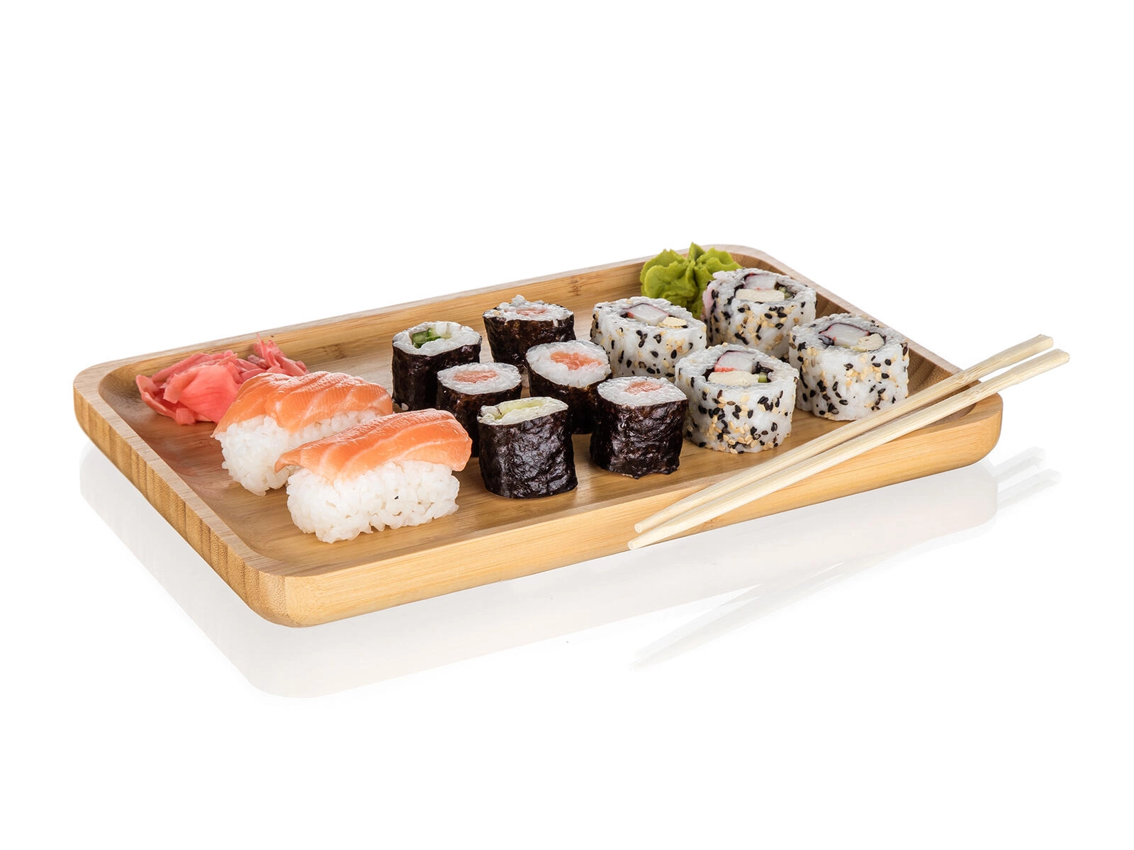 Wymiar 28 × 18,5 cm zapewnia wystarczająco dużo miejsca na rozmaite smakołyki. Doskonały do serwowania zestawów sushi, serów czy słodkości.