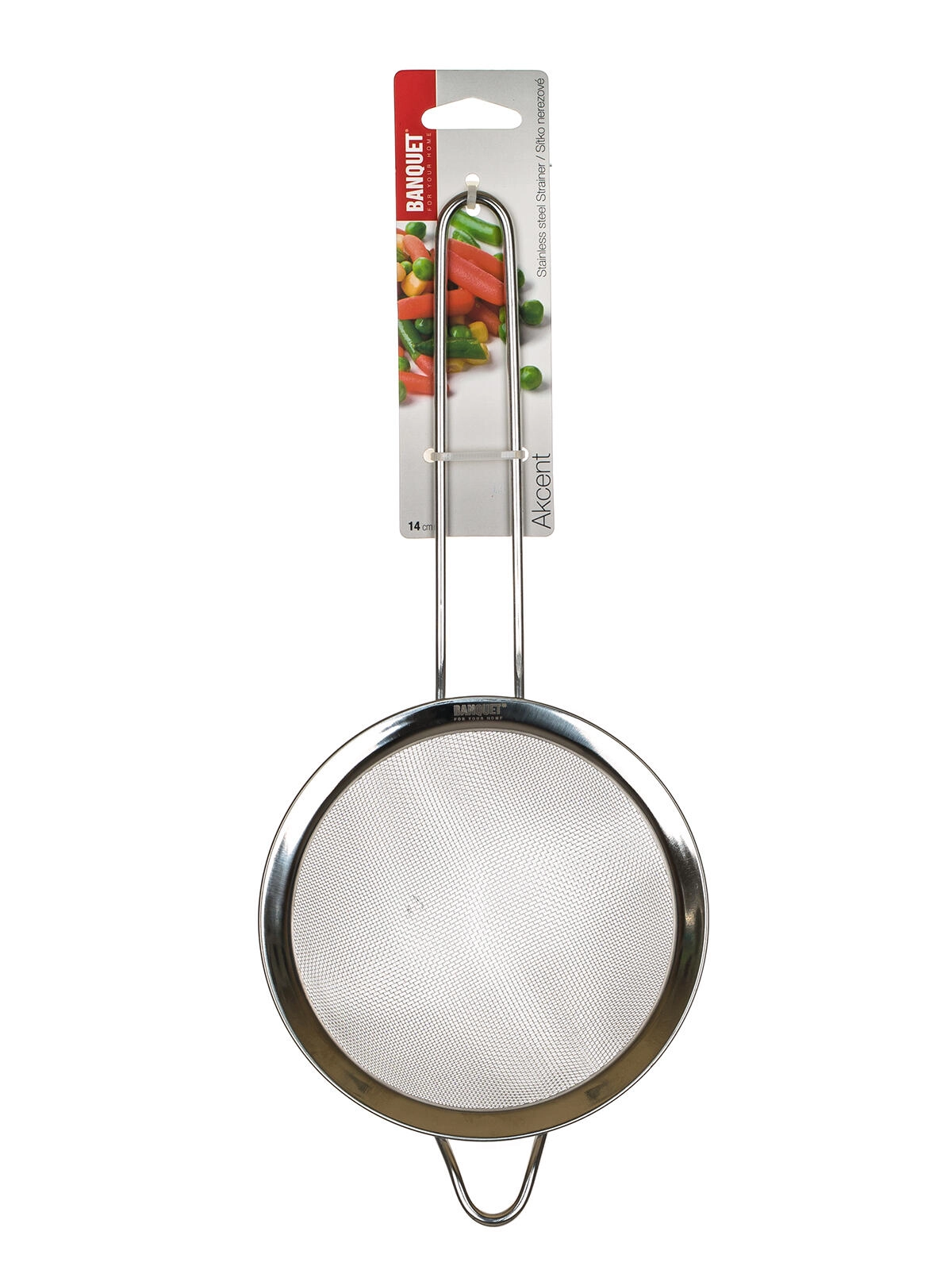Praktyczne kuchenne sitko AKCENT o średnicy 14 cm jest idealne do cedzenia płynów, płukania składników oraz delikatnej filtracji. Trwałe wykonanie ze stali nierdzewnej, wygodne metalowe uchwyty z oczkiem do zawieszenia oraz drobna siatka 0,28 mm o gęstości 20 oczek/cm² zapewniają czysty i szybki efekt podczas codziennego gotowania.