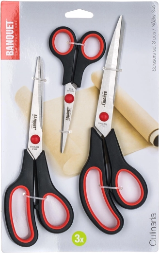 Uniwersalny zestaw nożyczek do domu i biura zawiera trzy rozmiary do różnych zastosowań: 14, 21 i 24 cm. Ostrza z wysokiej jakości stali zapewniają długą żywotność, a wygodne plastikowe rękojeści bezpieczny i komfortowy chwyt. Odpowiednie do papieru, tkanin oraz typowych prac domowych.