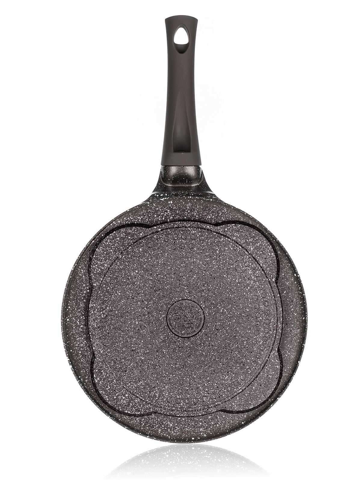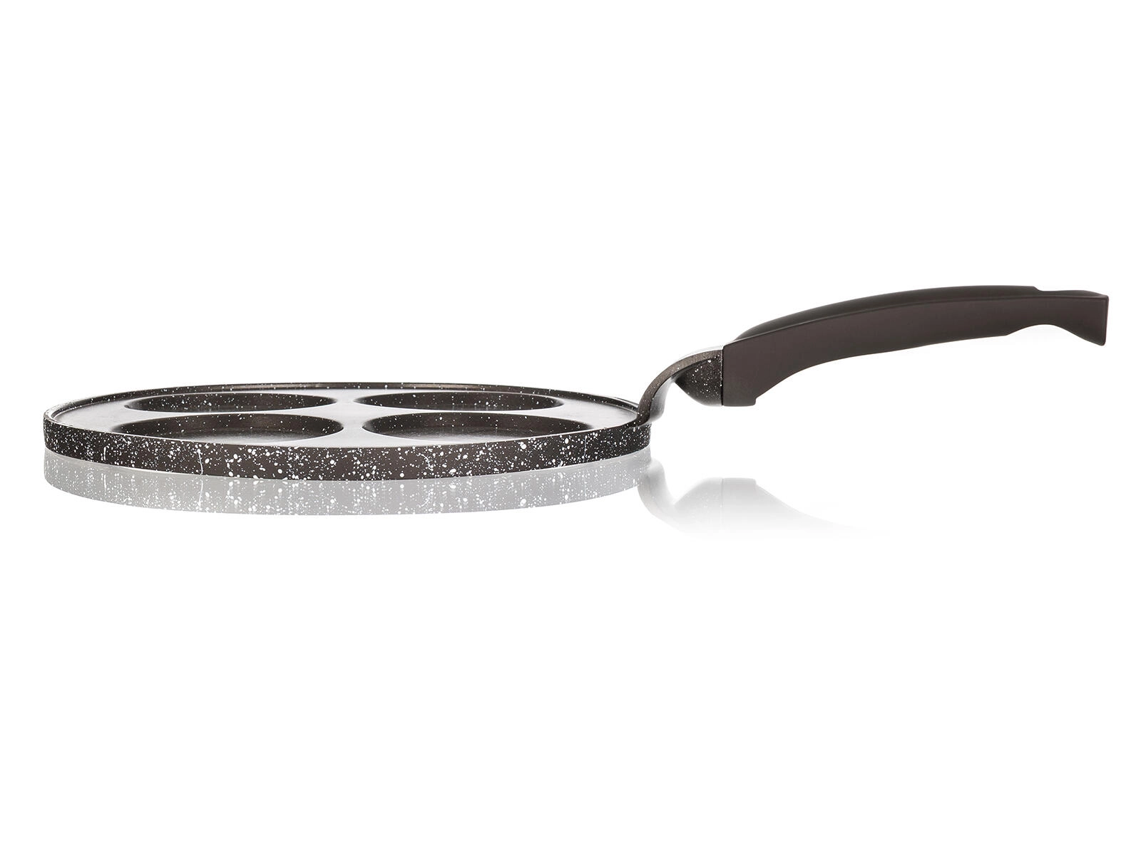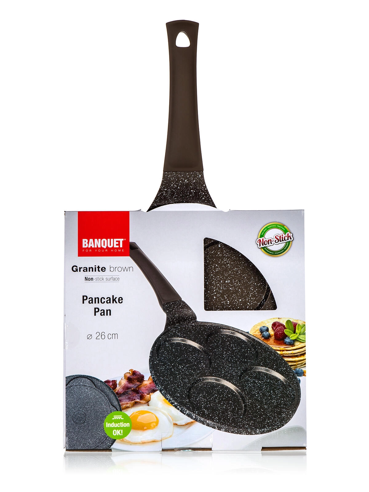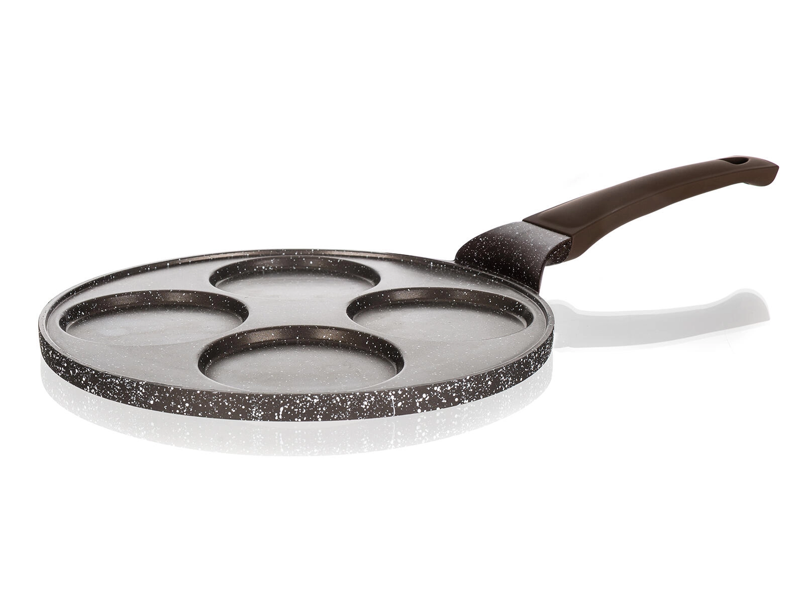 Patelnia do placuszków Granite Brown o średnicy 26 cm z czterema okrągłymi formami jest idealna do codziennego przygotowywania śniadań i szybkich przysmaków. Solidne aluminiowe korpus z nieprzywierającą powłoką zapewnia równomierne rozprowadzanie ciepła i łatwe uwalnianie potraw bez przypiekania.