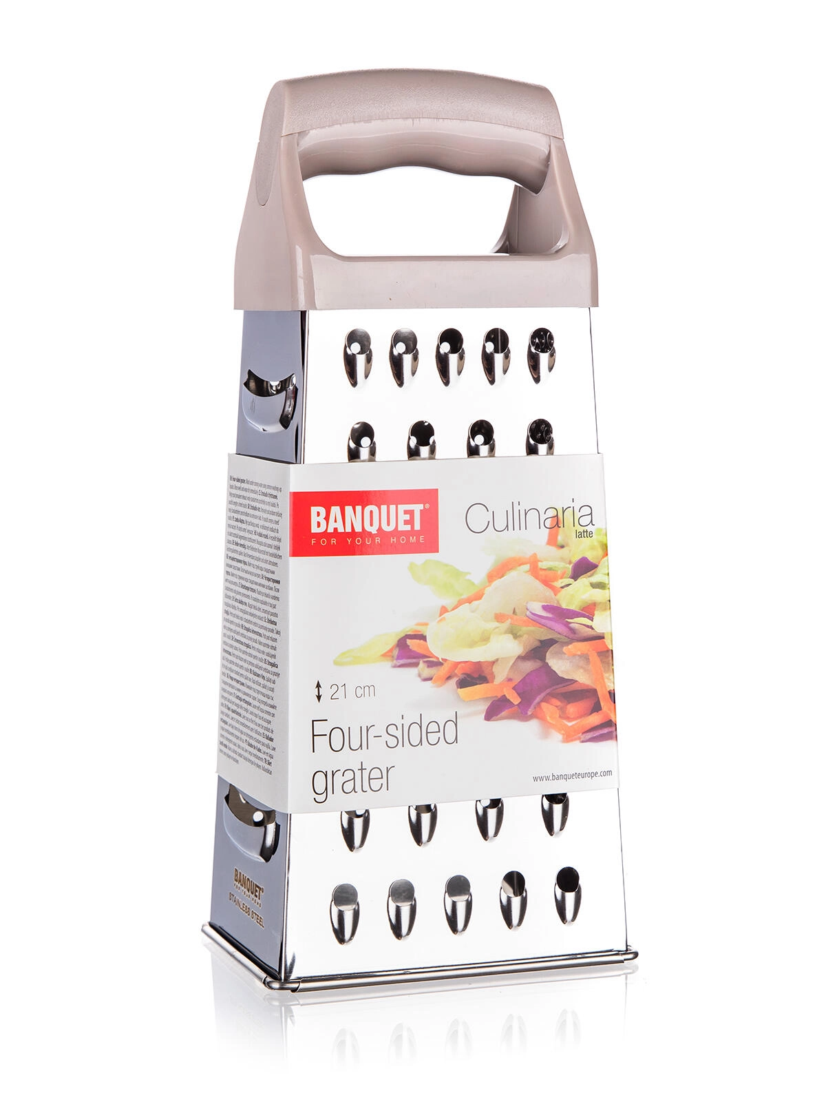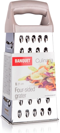 Praktyczna czterostronna piramidowa tarka ze stali nierdzewnej o wysokości 21 cm do łatwego tarcia warzyw, serów i owoców. Oferuje stabilną konstrukcję, wygodną plastikową rączkę w kolorze latte oraz łatwą pielęgnację.