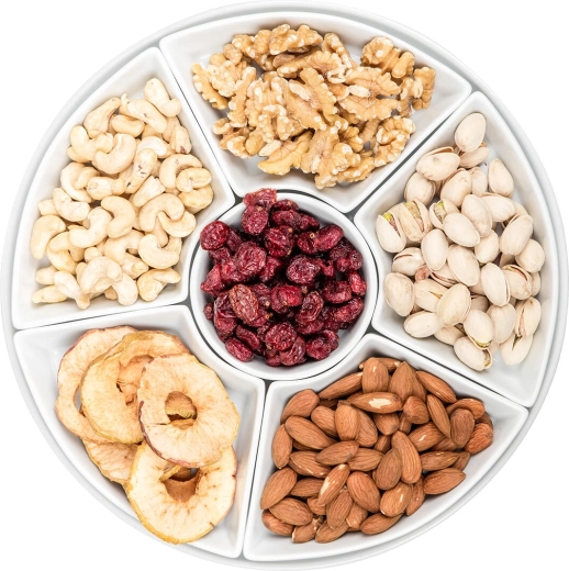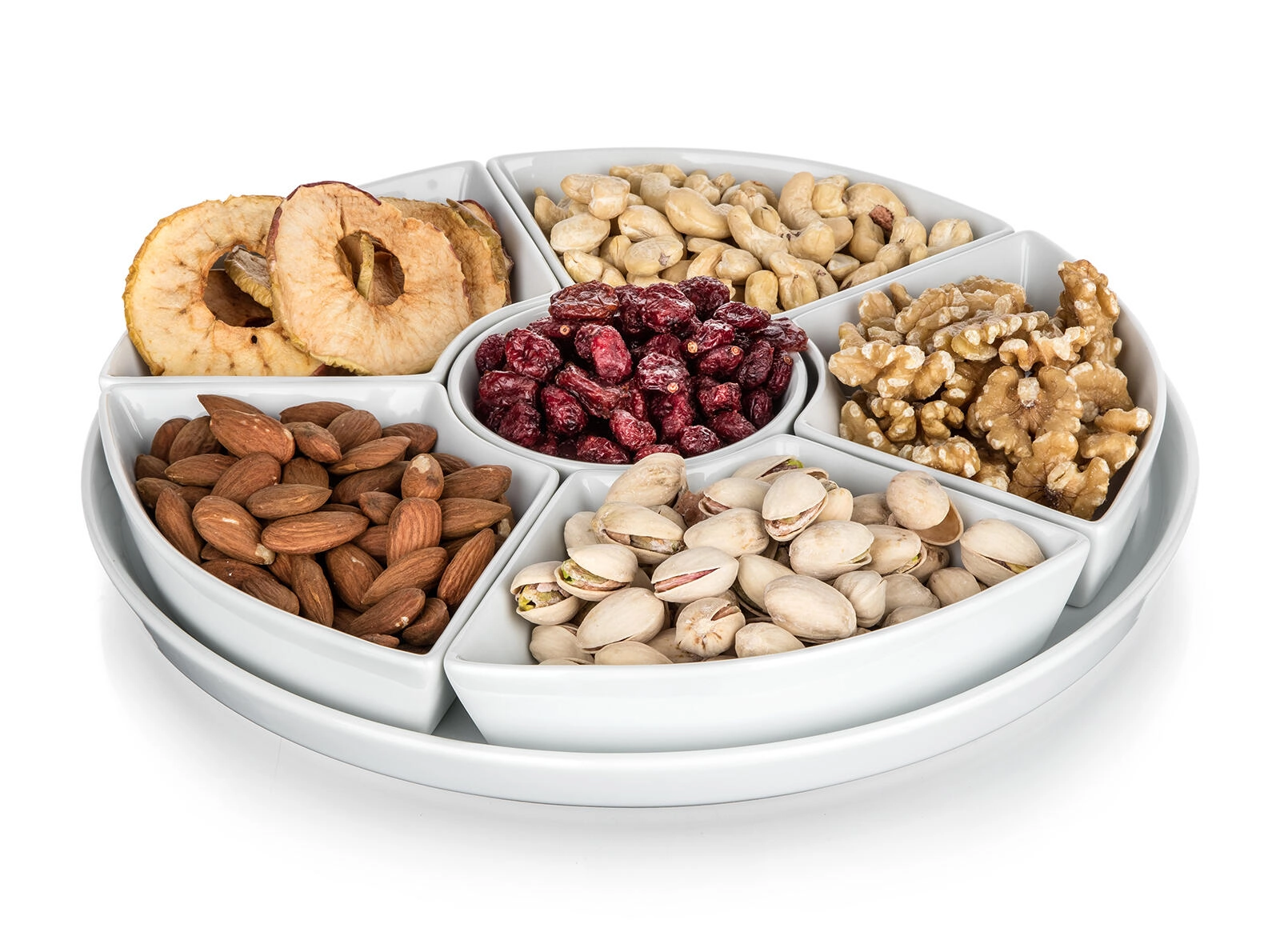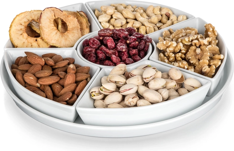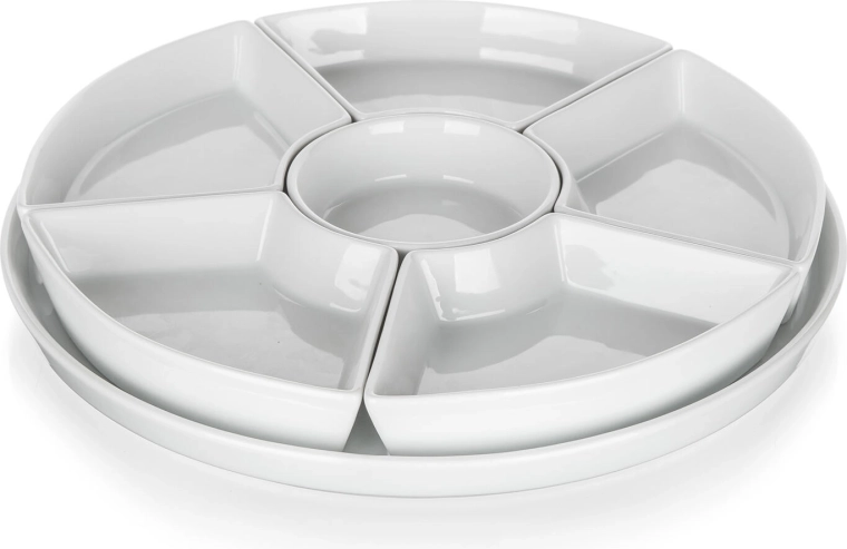 Wiele przegródek umożliwia jednoczesne serwowanie różnych rodzajów przekąsek – od snacków po sosy w centralnej miseczce.