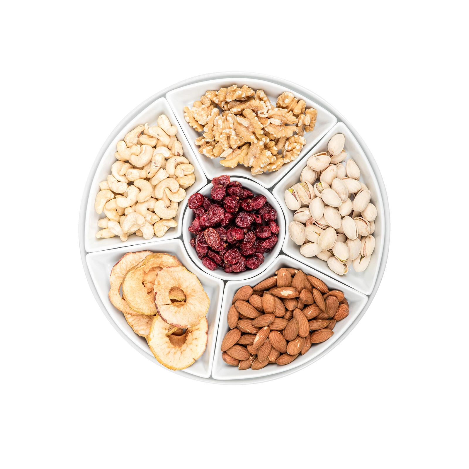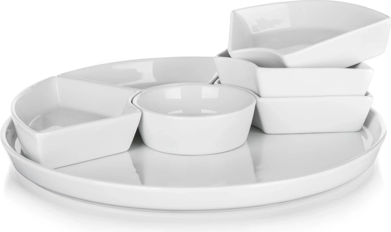 Okrągła taca i sześć oddzielnych miseczek utrzyma każdy rodzaj przekąsek osobno – przejrzyste serwowanie bez mieszania smaków.