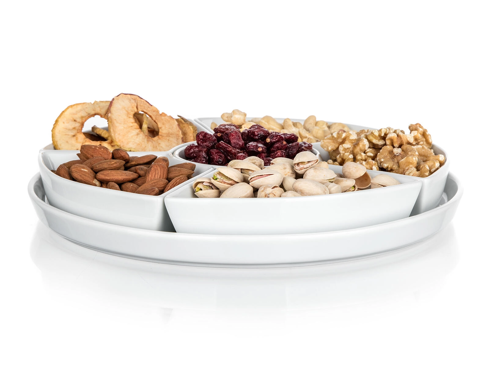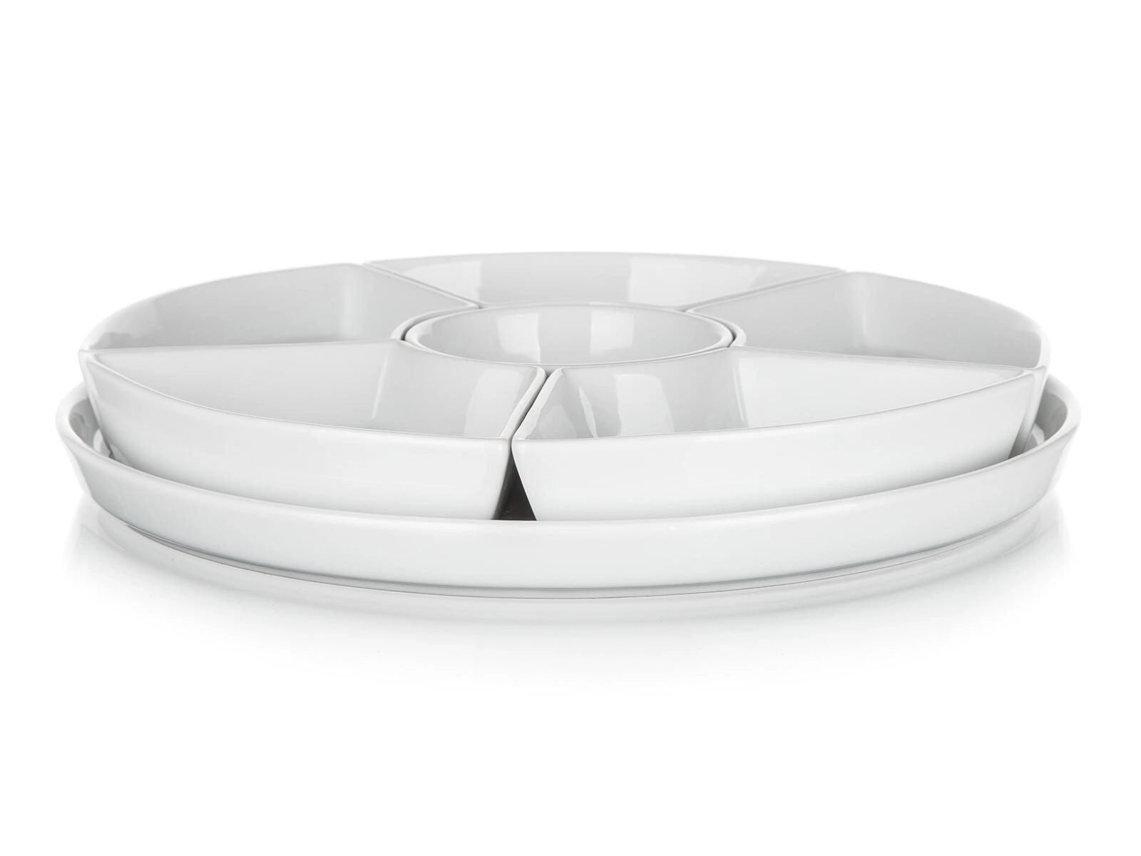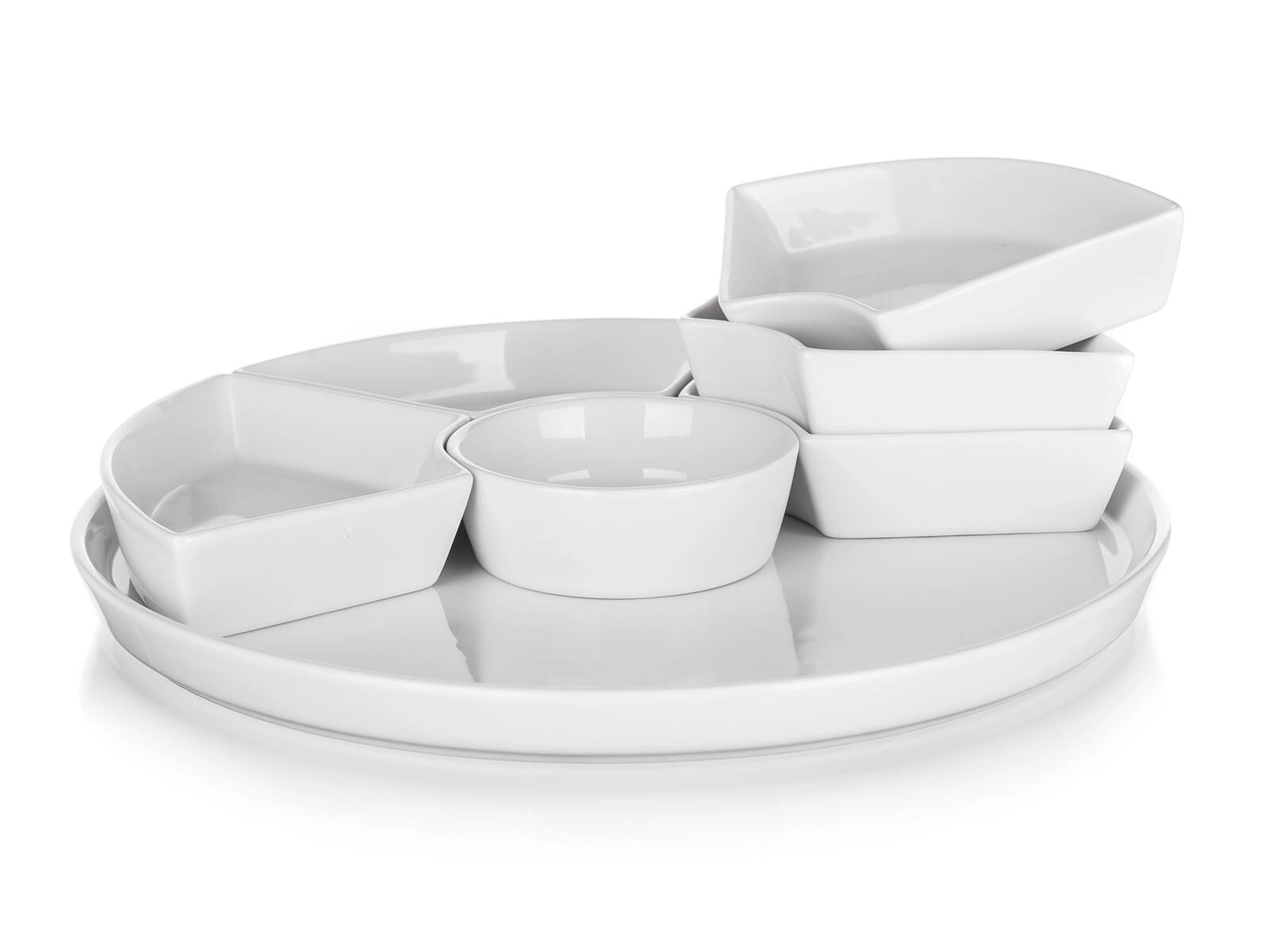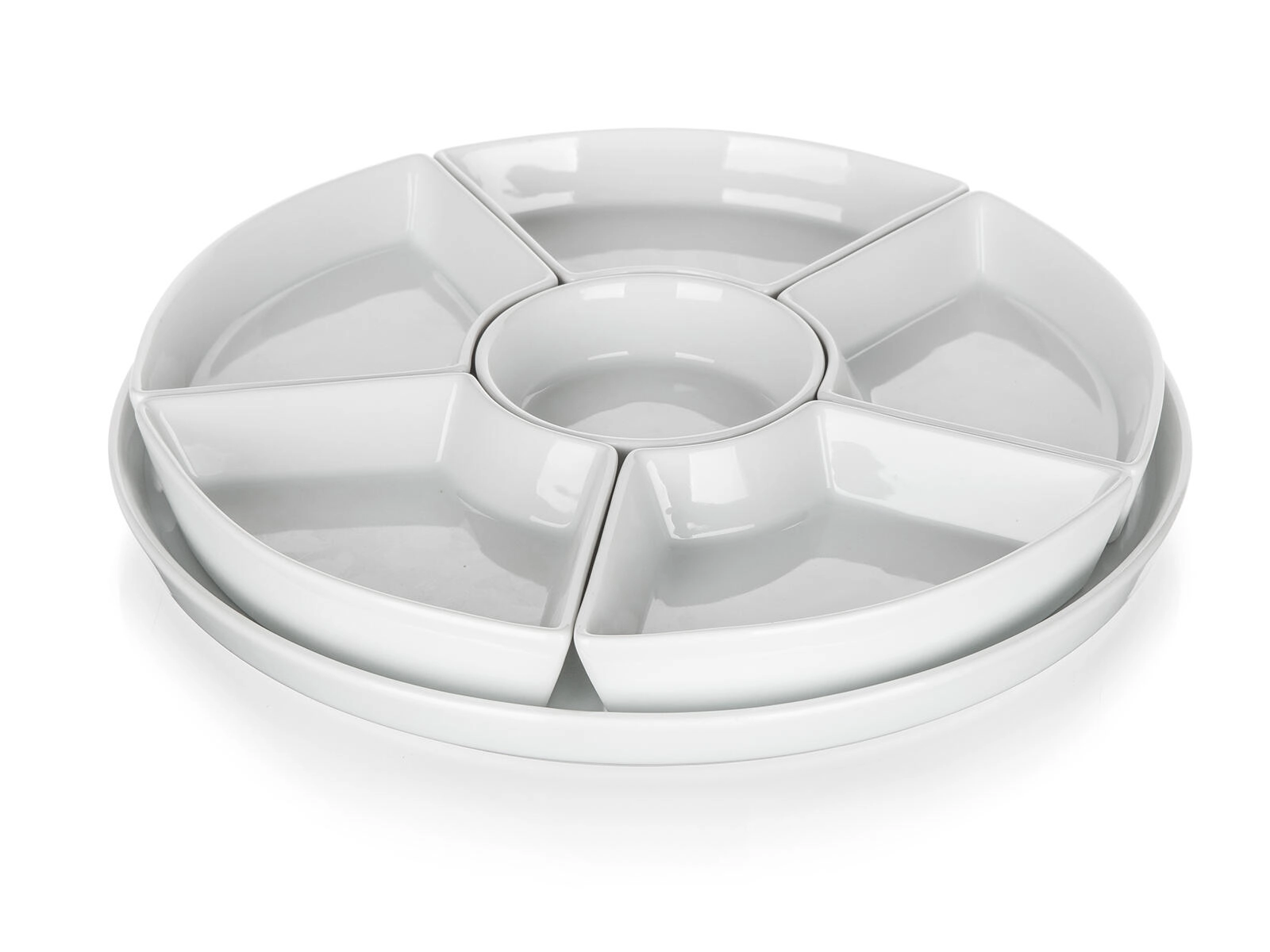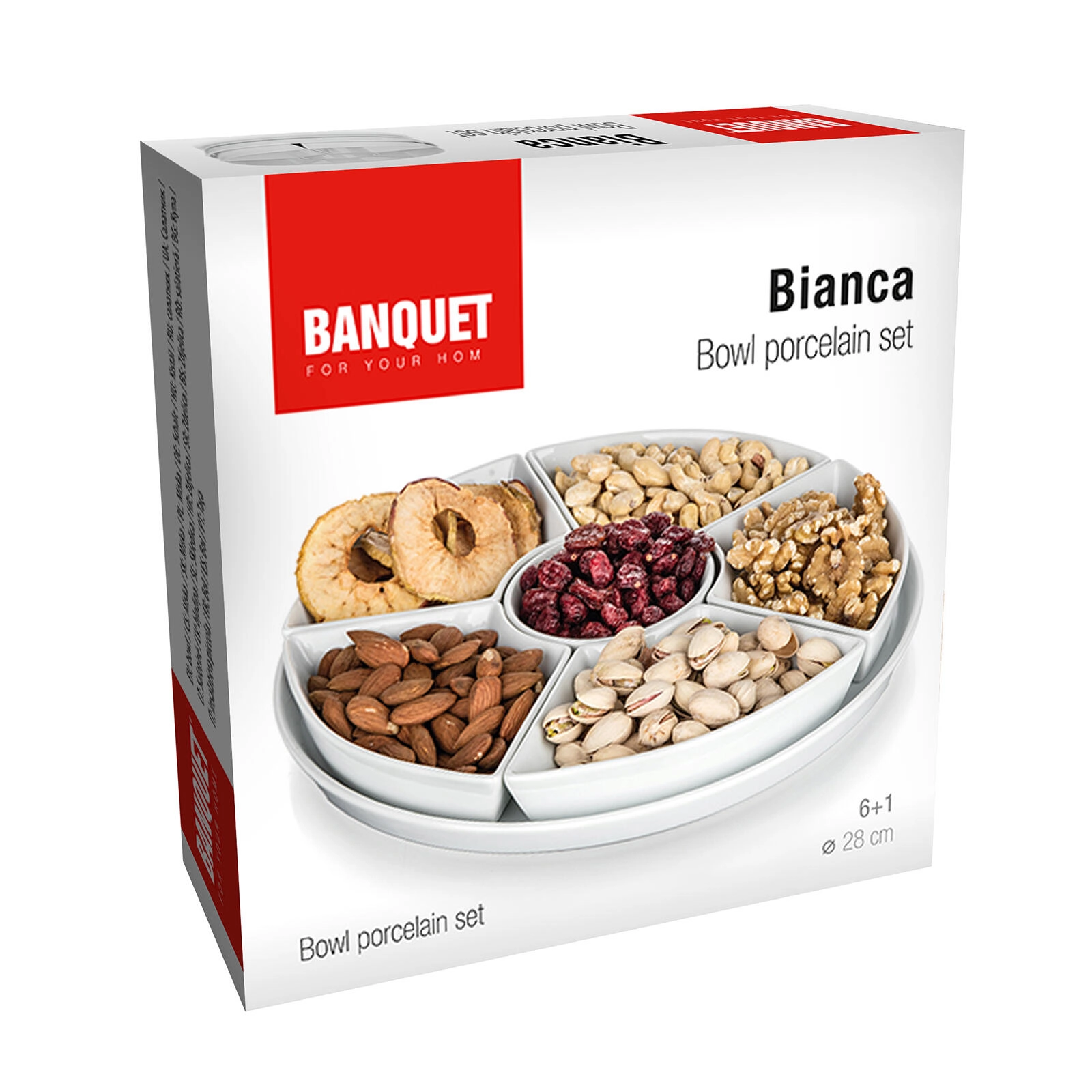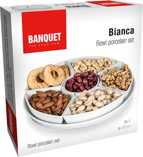 Stylowy, okrągły zestaw do serwowania BIANCA z białej porcelany łączy czysty design i praktyczność. Centralną tacę uzupełnia sześć dopasowanych kształtem miseczek, które pozwalają na oddzielne podawanie różnych smakołyków – od suszonych owoców i orzechów, przez warzywa, po sosy i dipy. Dzięki przejrzystemu podziałowi Twój stół będzie zawsze schludny i apetyczny.