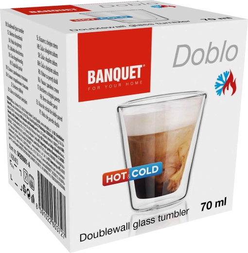 Elegancka podwójna szklanka DOBLO o pojemności 70 ml jest idealna do espresso, ristretto, degustacji destylatów lub małych deserów. Dwie ścianki tworzą warstwę termoizolacyjną, która utrzymuje napój dłużej gorący lub zimny, a jednocześnie chroni dłonie przed ciepłem.