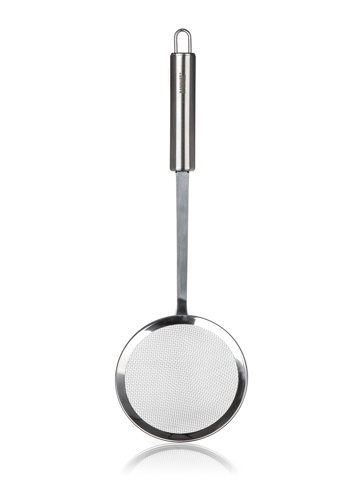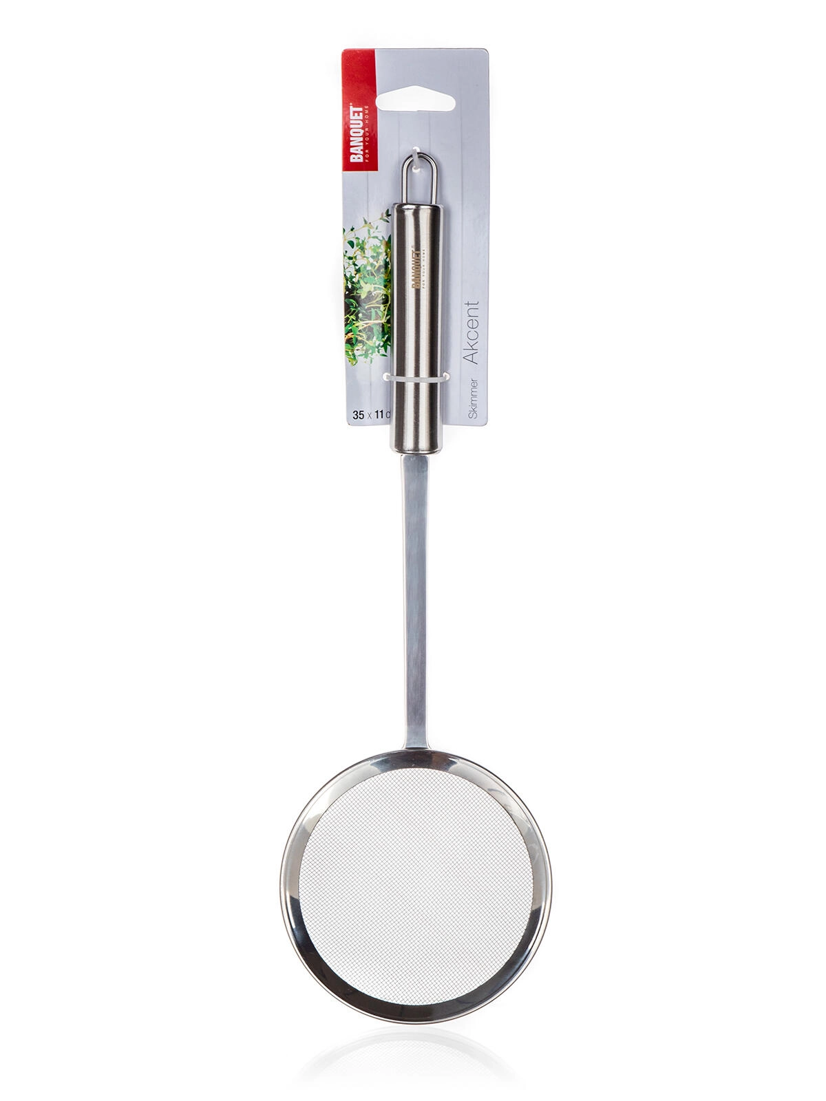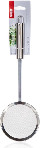 Szumówka z sitkiem AKCENT wykonana jest z trwałej stali nierdzewnej, co gwarantuje długą żywotność i łatwą pielęgnację. Gęsta siateczka skutecznie wyłapuje pianę i drobne zanieczyszczenia, a długa rączka zapewnia bezpieczną obsługę nad garnkami i frytkownicami.