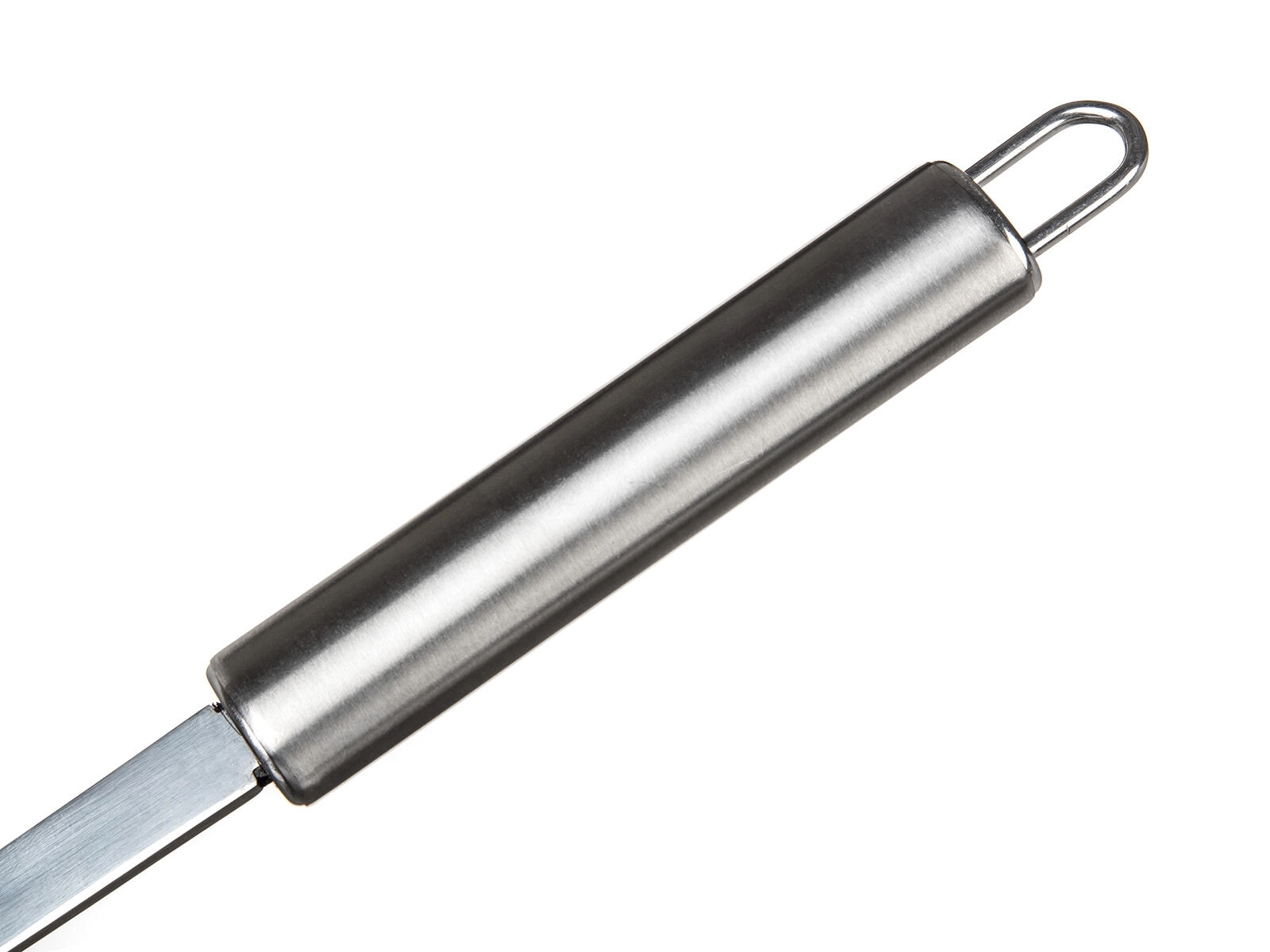 Długa, solidna rączka z oczkiem umożliwia komfortowy chwyt, bezpieczny dystans od źródła ciepła oraz praktyczne zawieszenie na listwie.