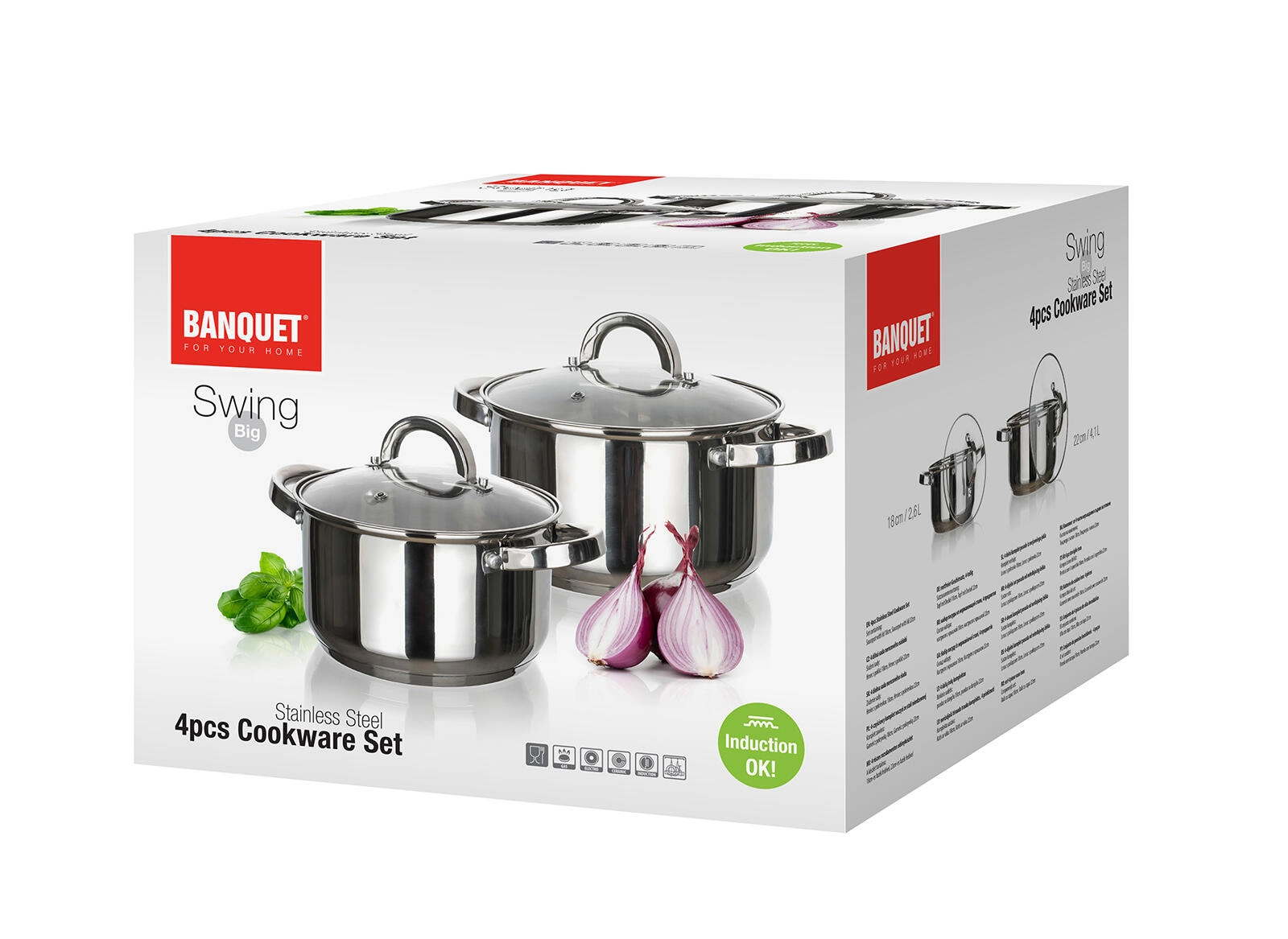 Uniwersalny zestaw garnków ze stali nierdzewnej SWING do codziennego gotowania zawiera dwa garnki o pojemnościach 2,6 l i 4,1 l wraz ze szklanymi pokrywkami z otworem na parę. Odpowiedni na wszystkie typy kuchenek, w tym indukcyjne, z polerowaną powierzchnią ze stali nierdzewnej wewnątrz i na zewnątrz oraz możliwością mycia w zmywarce dla łatwej pielęgnacji.