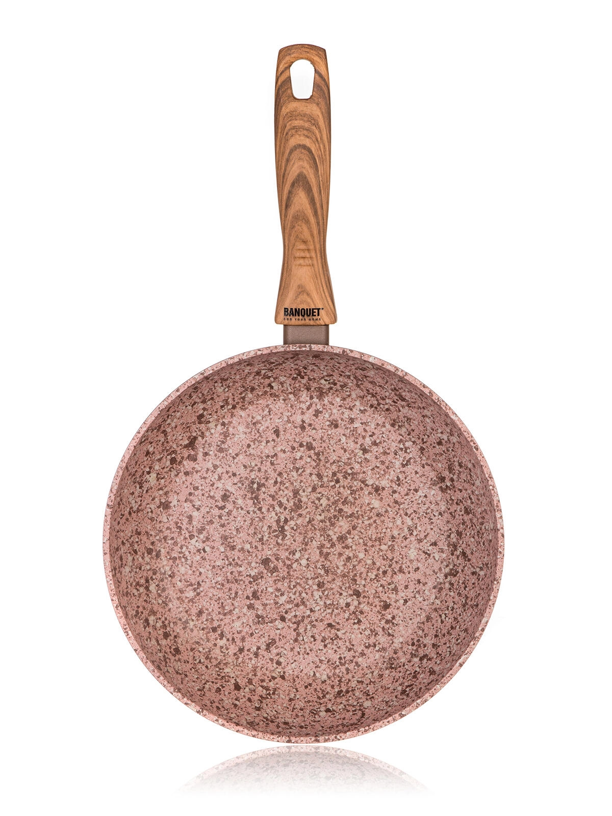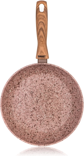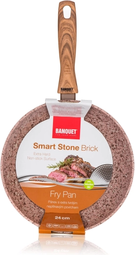 Uniwersalna patelnia 24 cm z powłoką SMART STONE Brick do codziennego gotowania. Oferuje dwuwarstwową nieprzywierającą powłokę, szybkie i równomierne rozprowadzanie ciepła dzięki kutemu aluminium oraz denko indukcyjne do wszystkich typów kuchenek. Ergonomiczny uchwyt bakelitowy z wykończeniem soft touch w dekorze drewna gwarantuje bezpieczny i wygodny chwyt, a łatwą pielęgnację dopełnia możliwość mycia w zmywarce.