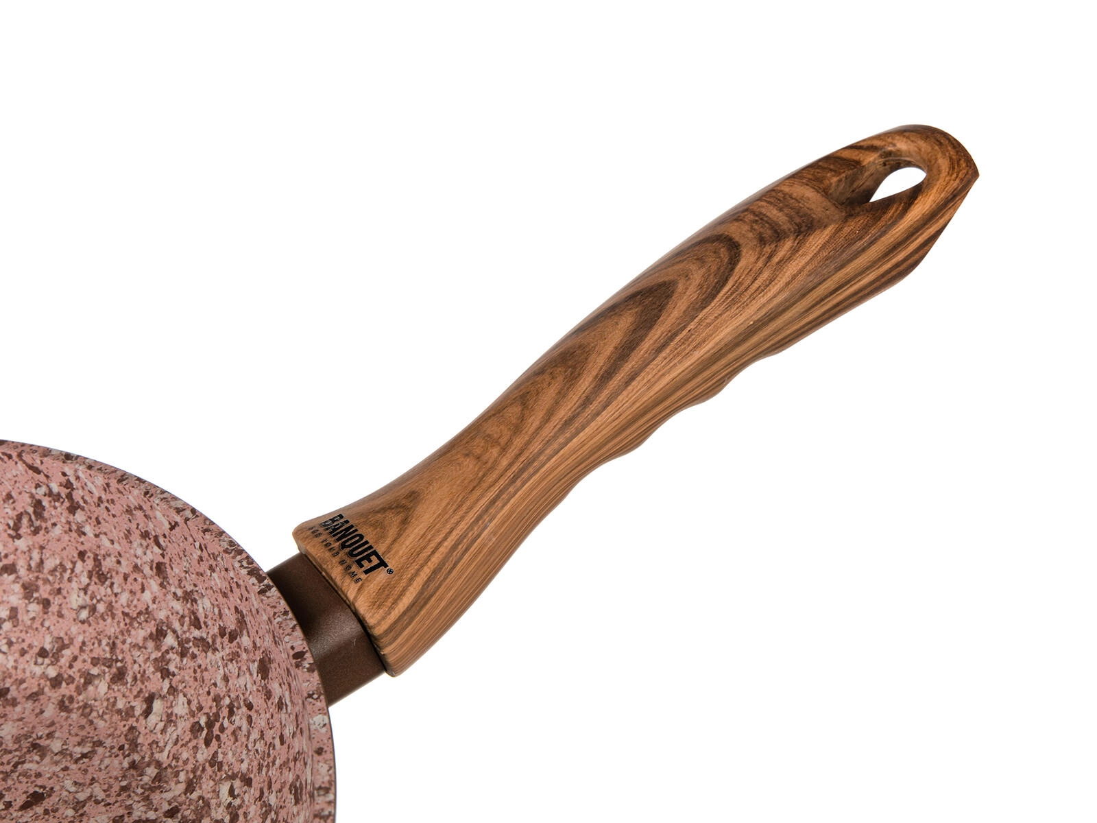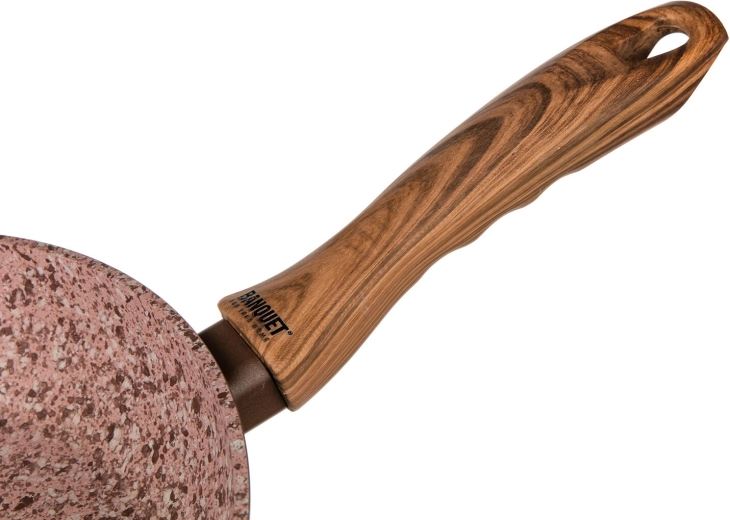 Bakelitowy uchwyt w imitacji drewna z antypoślizgową powierzchnią jest przyjemny w dotyku i pozostaje chłodny.