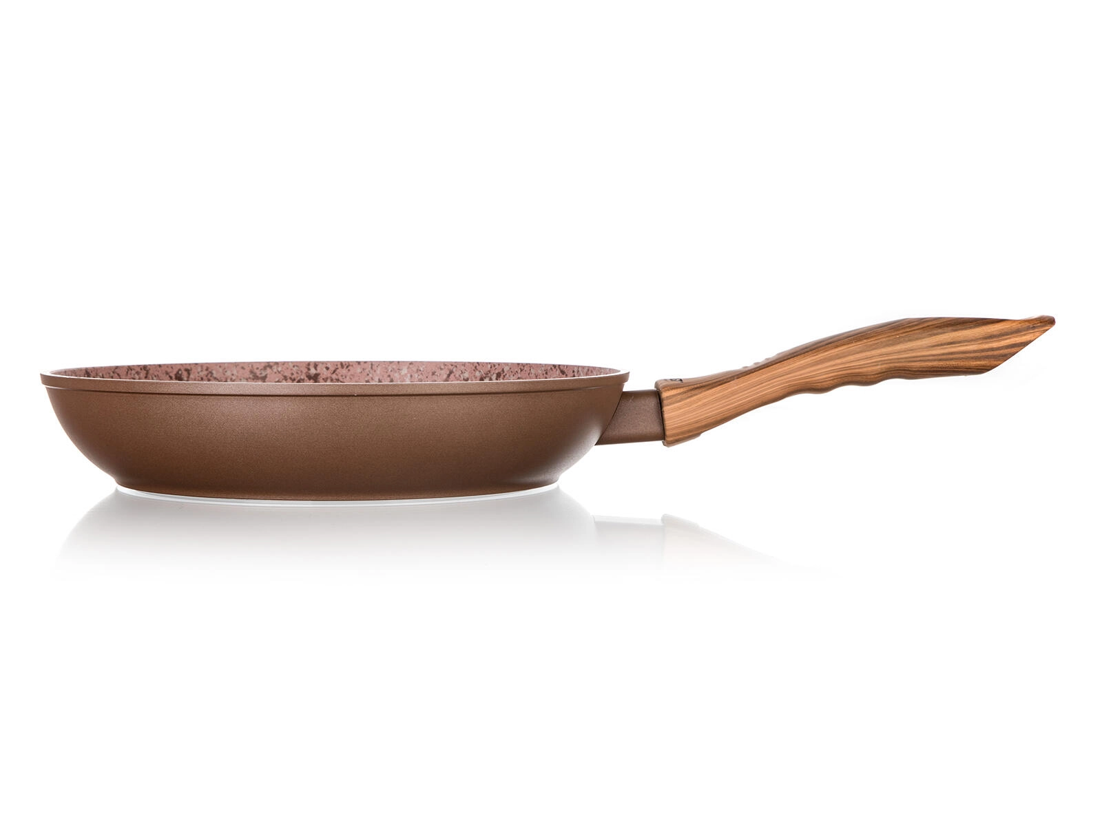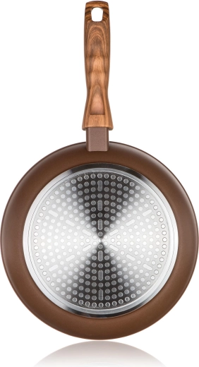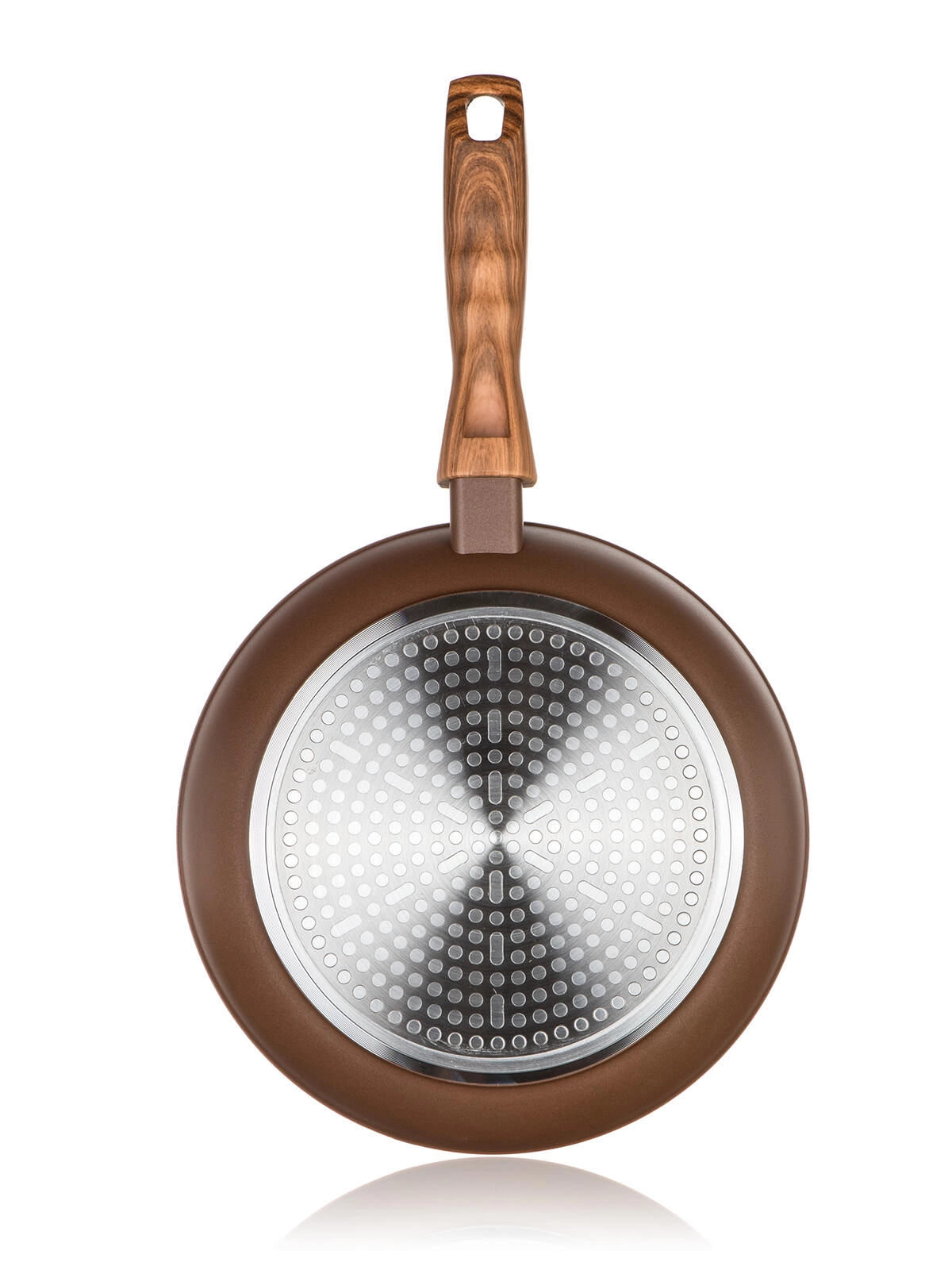 Dzięki pełnopowierzchniowemu denku indukcyjnemu patelnia jest kompatybilna z kuchenkami elektrycznymi, gazowymi, ceramicznymi i indukcyjnymi. Ergonomiczny bakelitowy uchwyt z powierzchnią soft touch w imitacji drewna dobrze leży w dłoni i pozostaje przyjemnie chłodny.