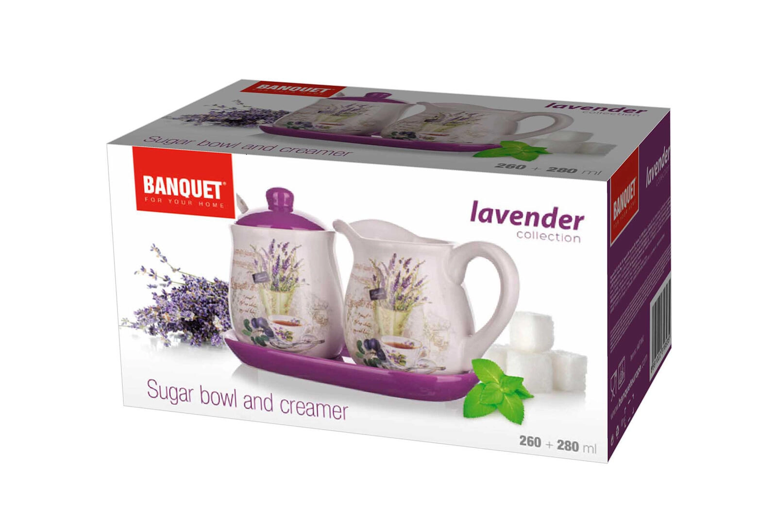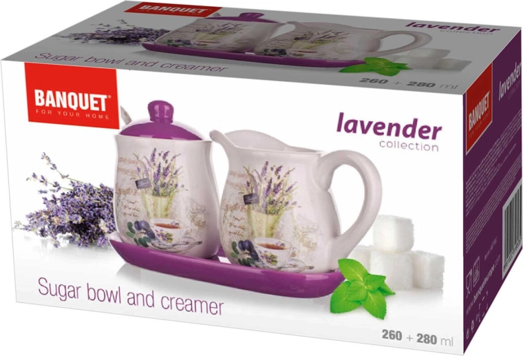 Elegancki ceramiczny zestaw do kuchni z motywem lawendy do stylowego serwowania kawy i herbaty. Zawiera dzbanuszek na mleko 260 ml, cukiernicę 280 ml, łyżeczkę oraz tackę. Wysokiej jakości ceramika zapewnia trwałość i łatwą pielęgnację; nadaje się do zmywarki (dla długotrwałego zachowania wyglądu zalecane mycie ręczne).