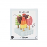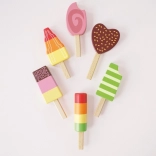 Sześć unikatowo malowanych drewnianych lodów w wesołych kolorach i kształtach pobudza wyobraźnię i zachęca do nieskończonej zabawy w lodziarnię.