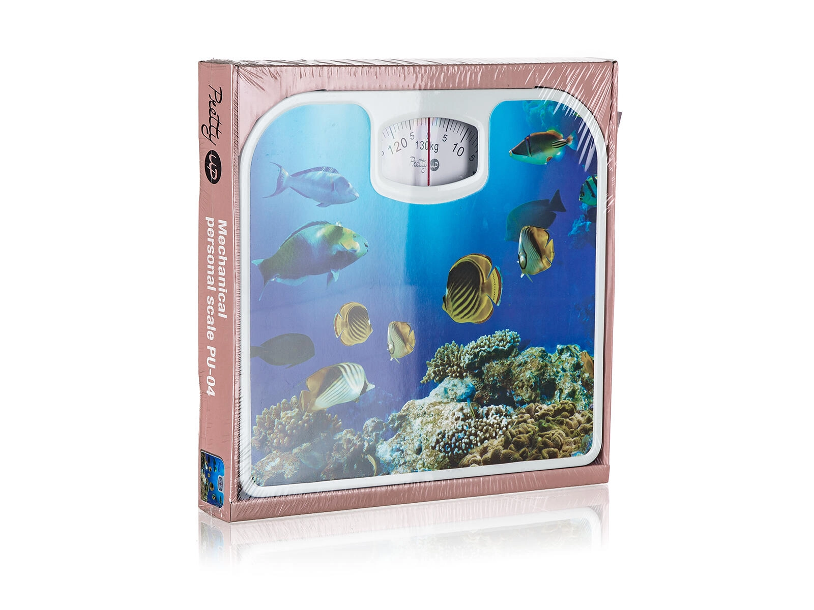 Ta osobista mechaniczna waga łączy niezawodną funkcjonalność z atrakcyjnym designem. Dekor podwodnego świata odświeży wygląd Twojej łazienki, a analogowa skala do 130 kg zapewni szybki i przejrzysty odczyt wagi.