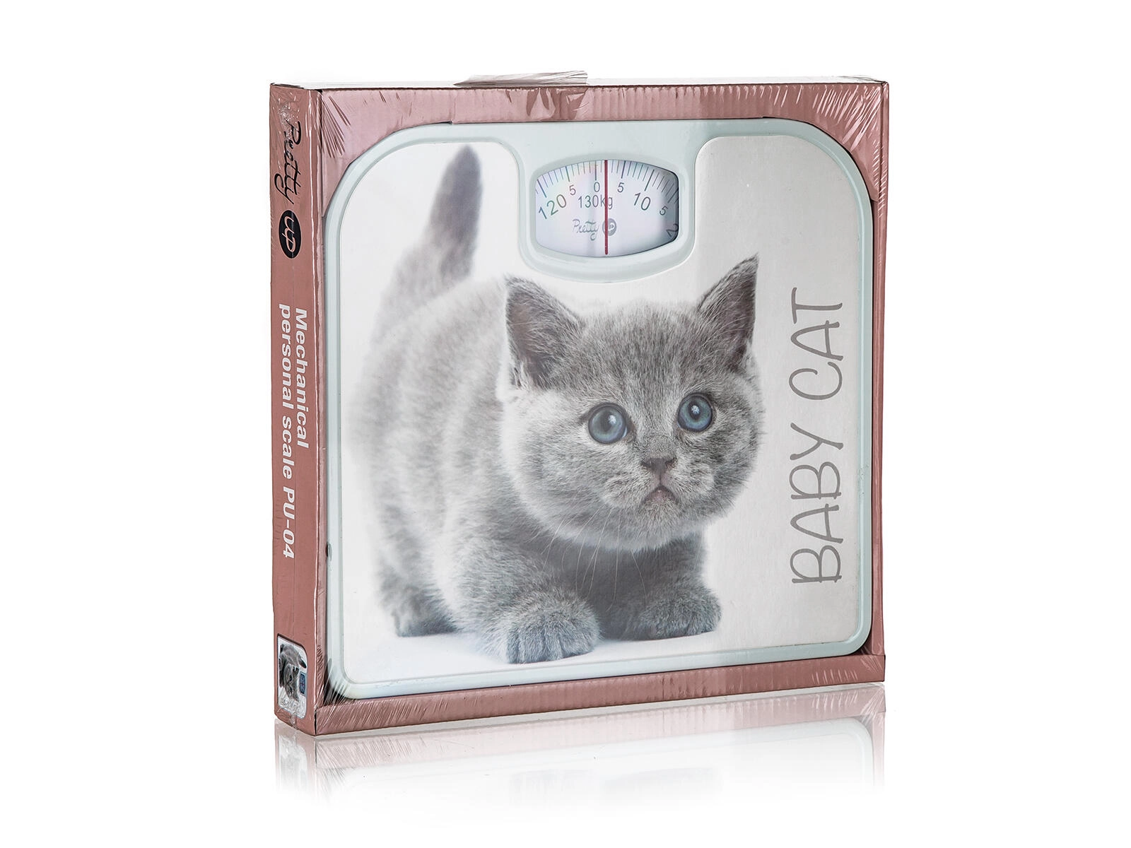 Stylowa osobista waga z uroczym motywem kotka wyróżnia się klasyczną, mechaniczną konstrukcją i kompaktowymi wymiarami. Oferuje maksymalne obciążenie 130 kg, czytelną podziałkę oraz pokrętło do łatwego wyzerowania. Dzięki metalowej konstrukcji jest trwała i idealna do każdego domu.