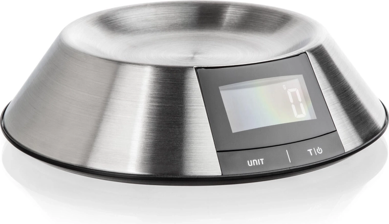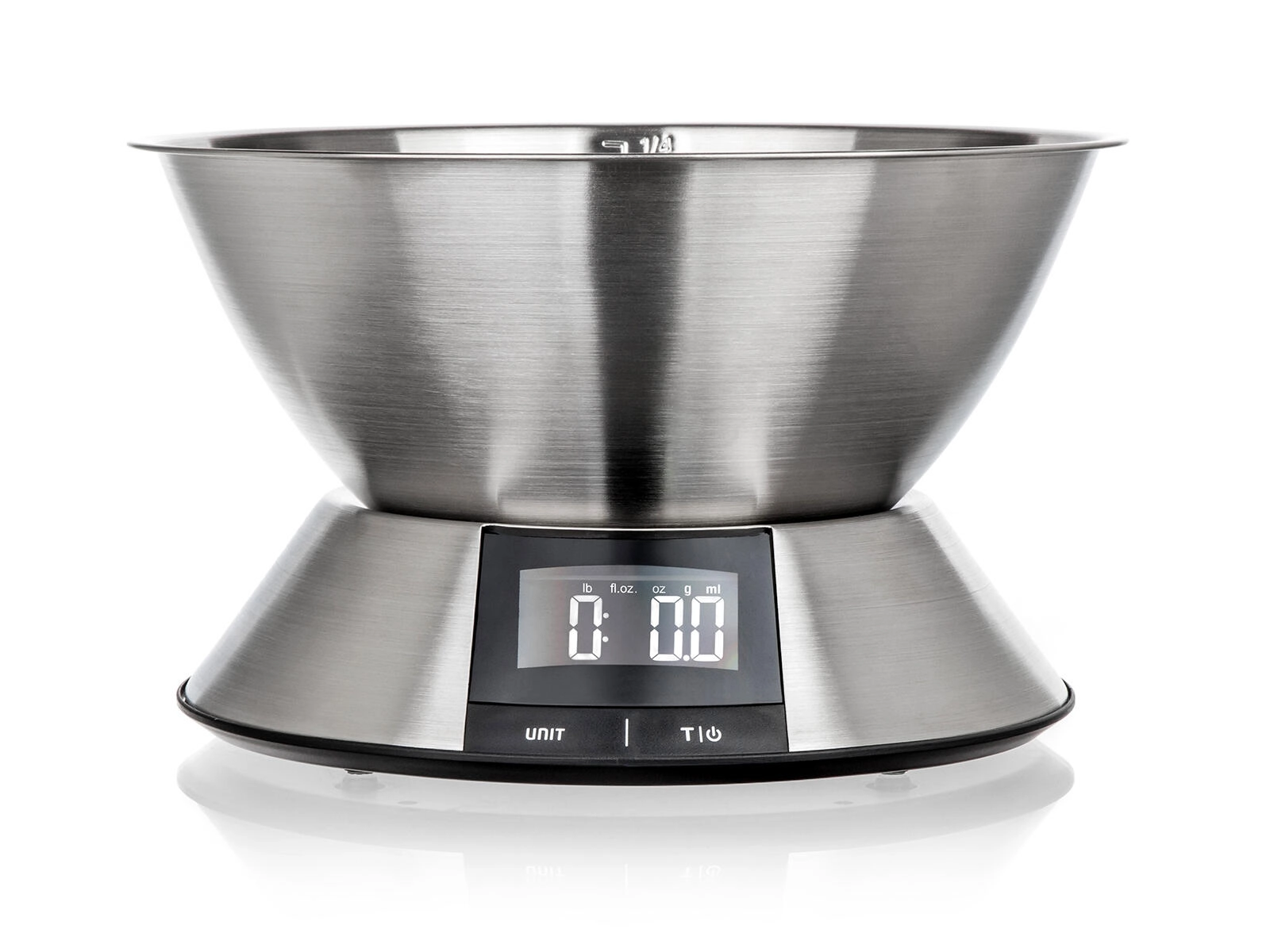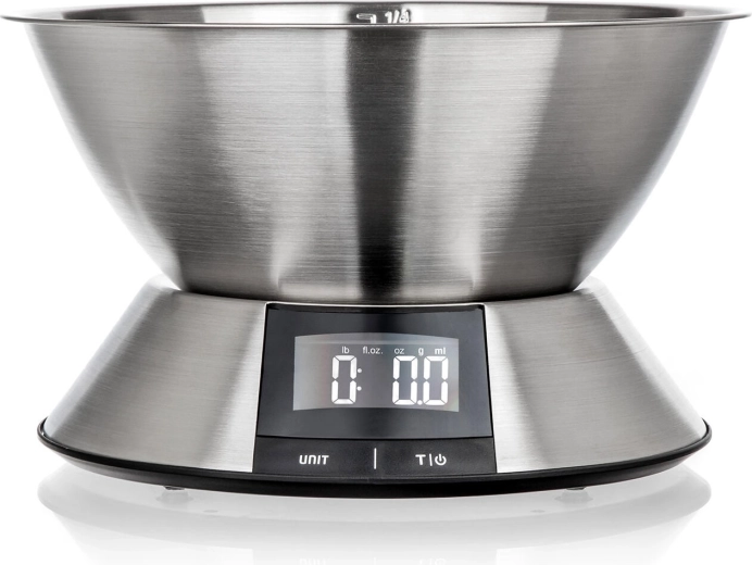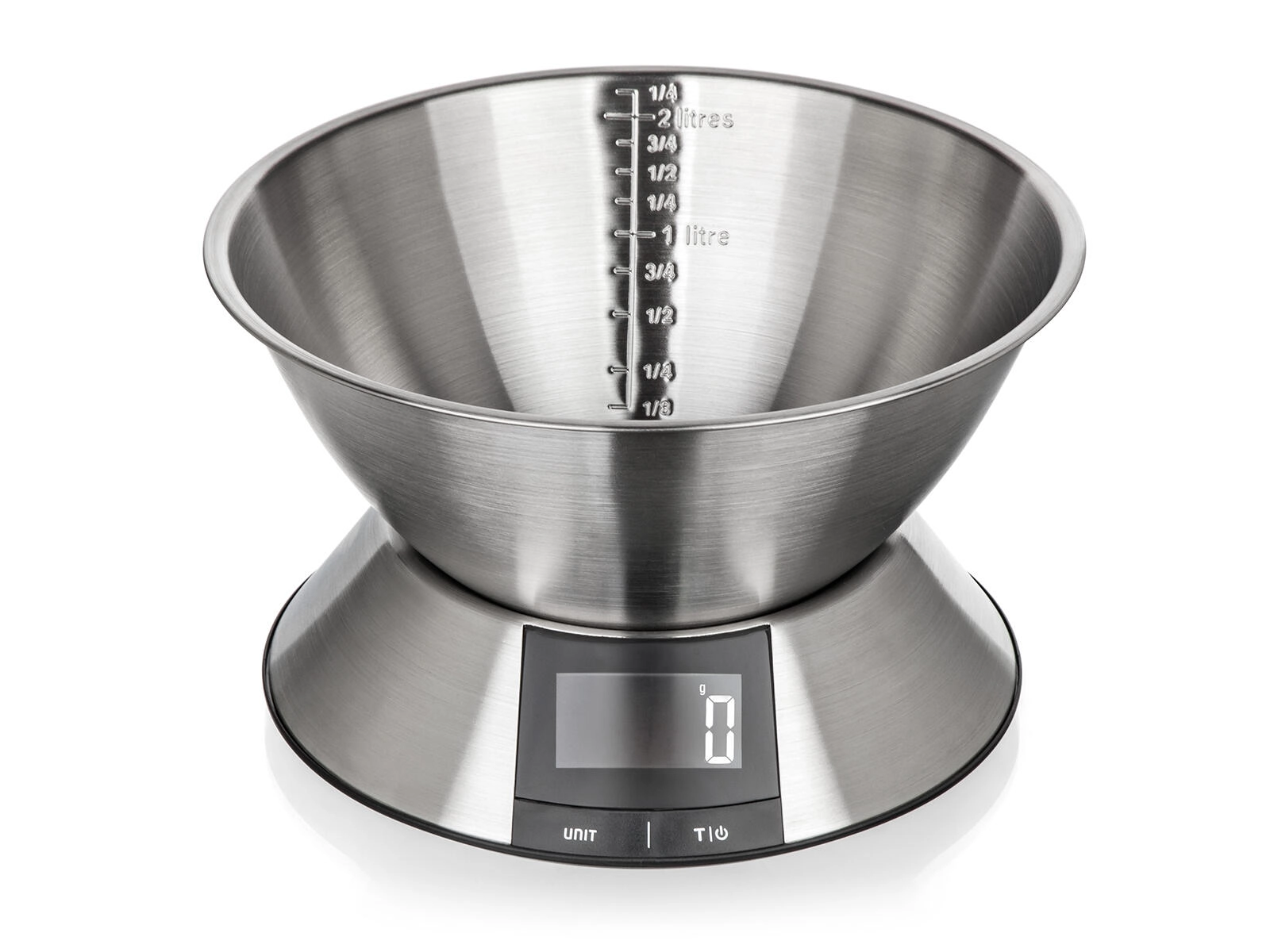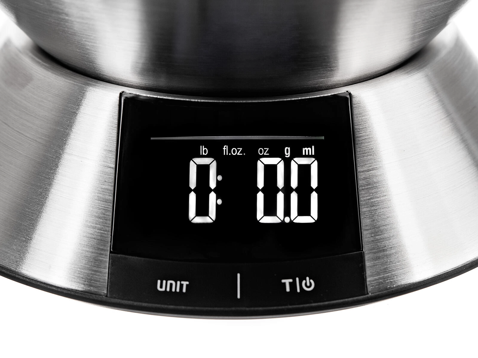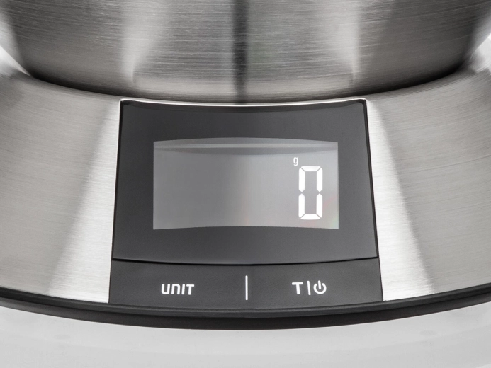 Zintegrowana miska ze stali nierdzewnej z tłoczoną podziałką do 2 litrów umożliwia precyzyjne odmierzanie płynów i produktów sypkich bezpośrednio podczas ważenia.