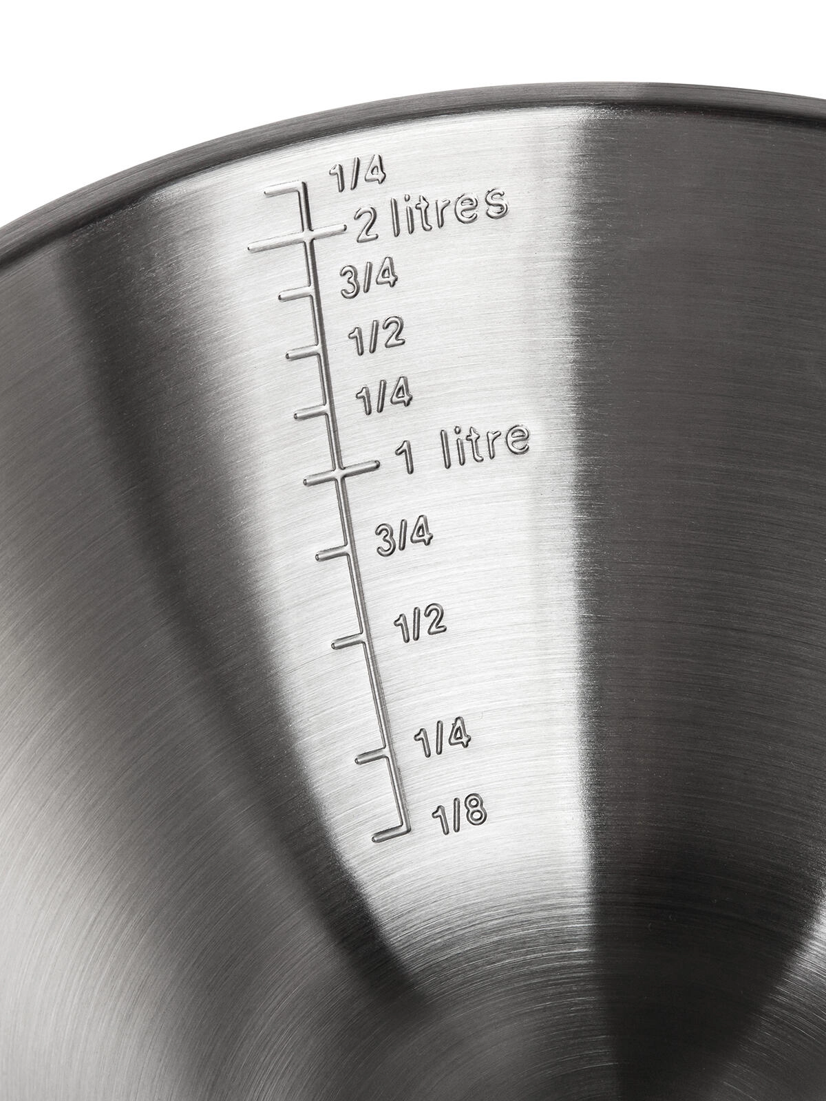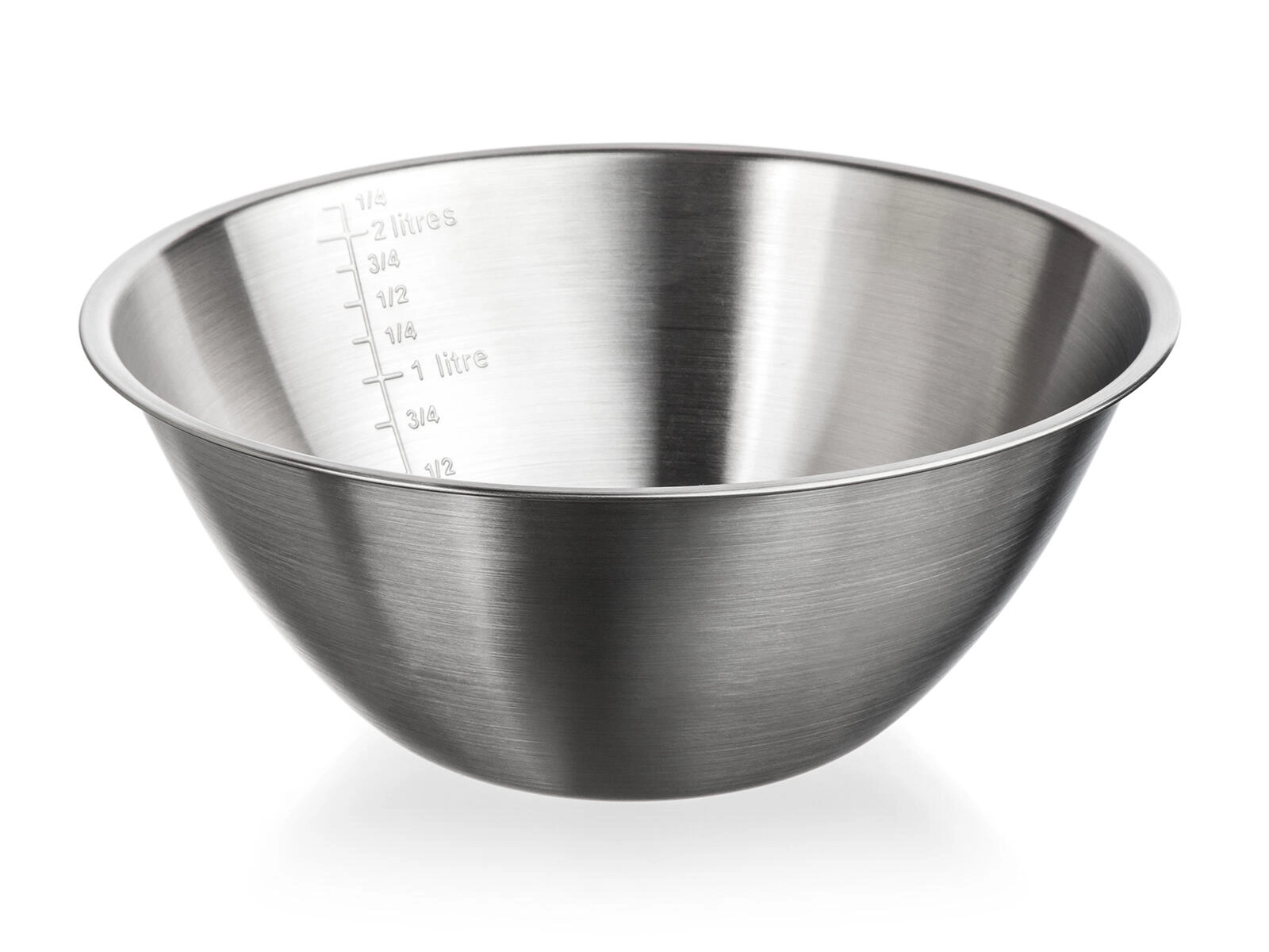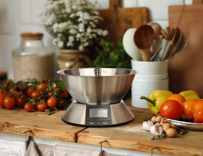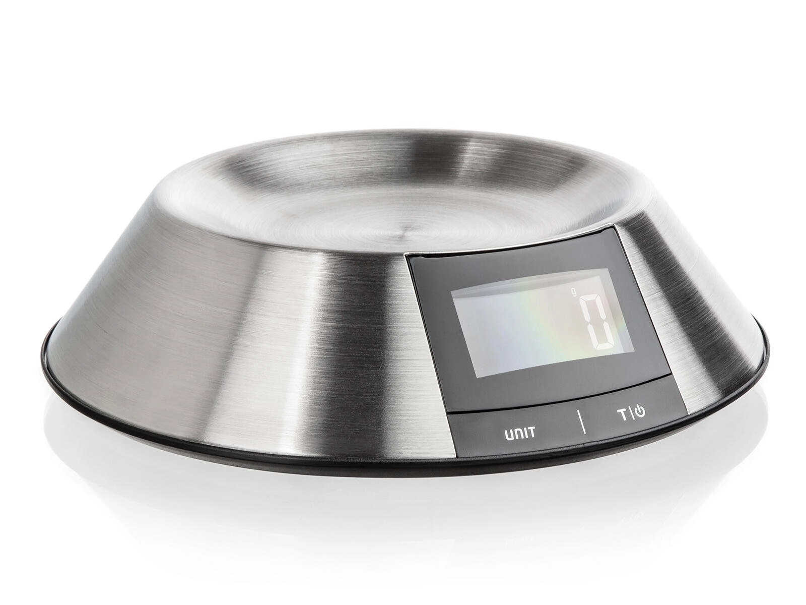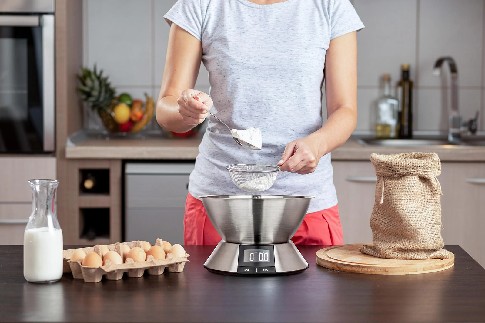 Zintegrowana miska ze stali nierdzewnej z tłoczoną podziałką do 2 litrów umożliwia precyzyjne odmierzanie płynów i produktów sypkich bezpośrednio podczas ważenia.