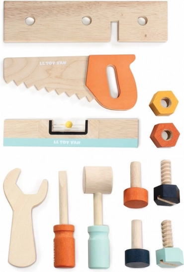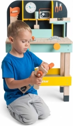 Bogaty zestaw 12 drewnianych akcesoriów jest idealny dla małych rączek: piłka, młotek, śrubokręt, klucz, poziomica, 2 śruby, 2 wkręty, 2 gwoździe i płytka. Zabawa rozwija kreatywność, myślenie logiczne i sprawność manualną. Warsztat zdobył liczne nagrody i należy do nagradzanej kolekcji Auta & budowa od LE TOY VAN.