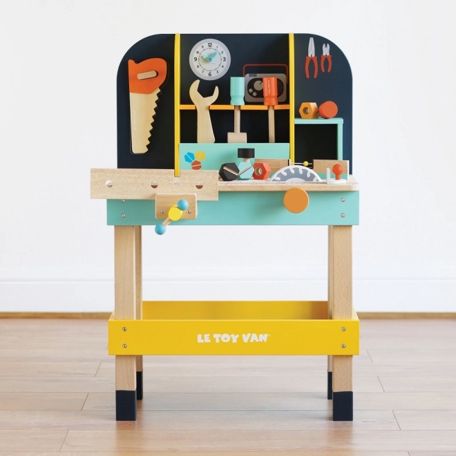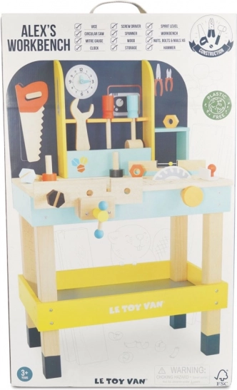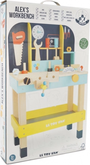 Dziecięcy drewniany warsztat ALEX od LE TOY VAN oferuje wszystko, czego mali naprawiacze potrzebują do realistycznej zabawy. Dzięki solidnemu wykonaniu z certyfikowanego drewna FSC oraz nietoksycznym farbom jest bezpieczny, trwały i przyjazny dla środowiska. W zestawie znajduje się wbudowana piła tarczowa, miarka i imadło, górna półka z haczykami oraz dolna przestrzeń na dodatkowe wyposażenie.