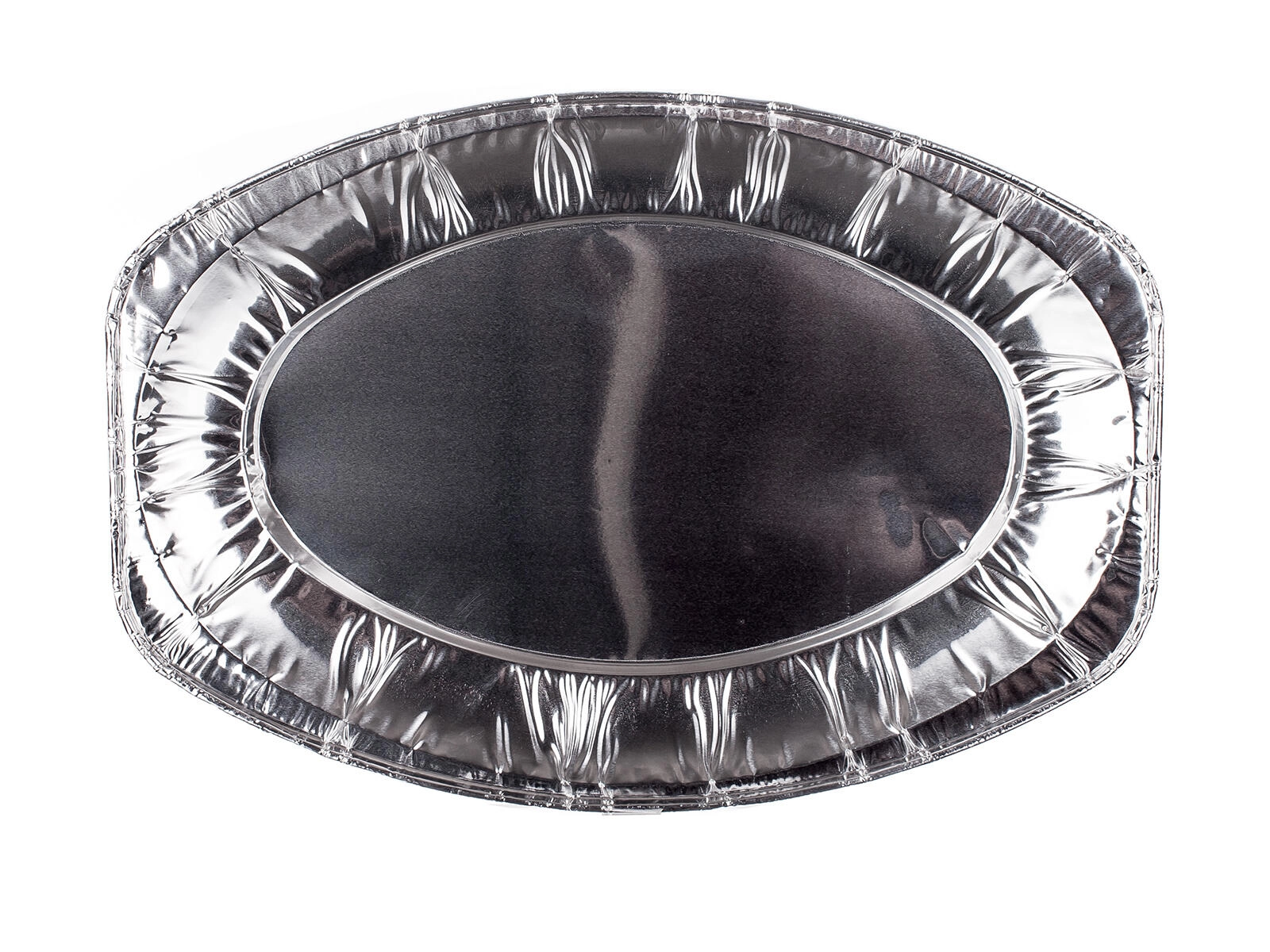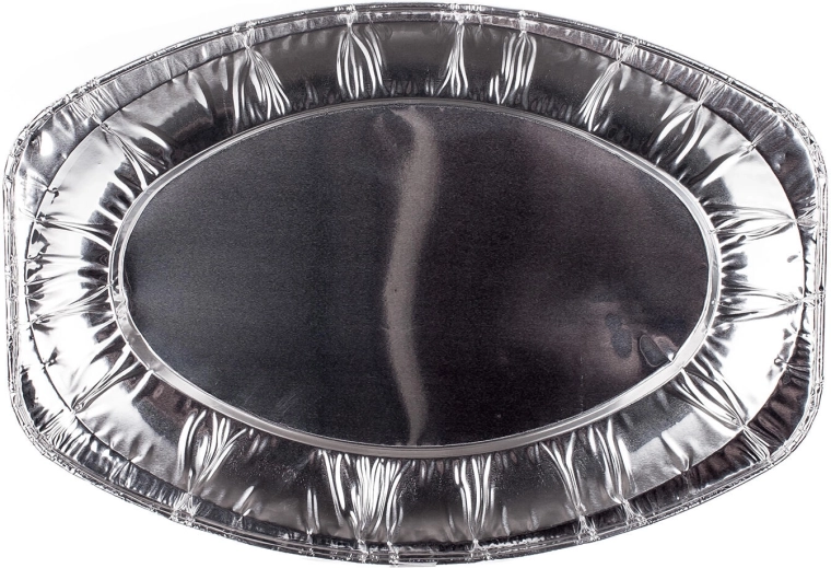 Praktyczna owalna taca do serwowania z aluminium o wymiarach 33,5 × 23,5 cm, w opakowaniu po 2 sztuki, idealna do grillowania, pieczenia i serwowania. Lekki i wytrzymały materiał zapewnia wygodną obsługę i higieniczne podawanie potraw. Odpowiednia do grillowania mięsa i innych dań, niska waga oraz łatwa utylizacja lub recykling po użyciu.