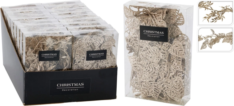 Elegancka girlanda z liśćmi o długości 180 cm wyróżnia się złotym kolorem i błyszczącym efektem, który wprowadza świąteczną atmosferę do każdego wnętrza. Dostępna w miksie 2 rodzajów dla łatwego dopasowania do dekoracji.