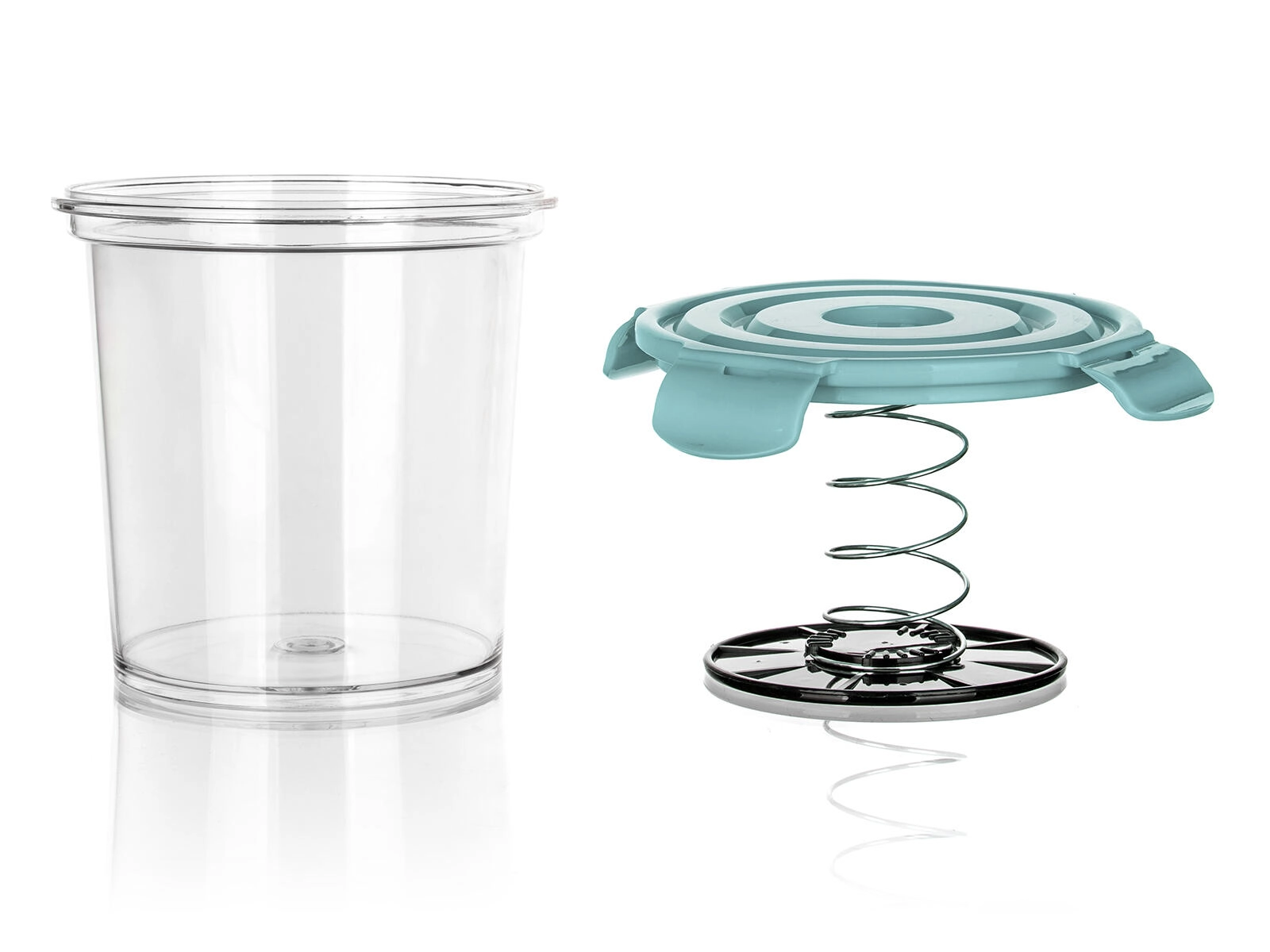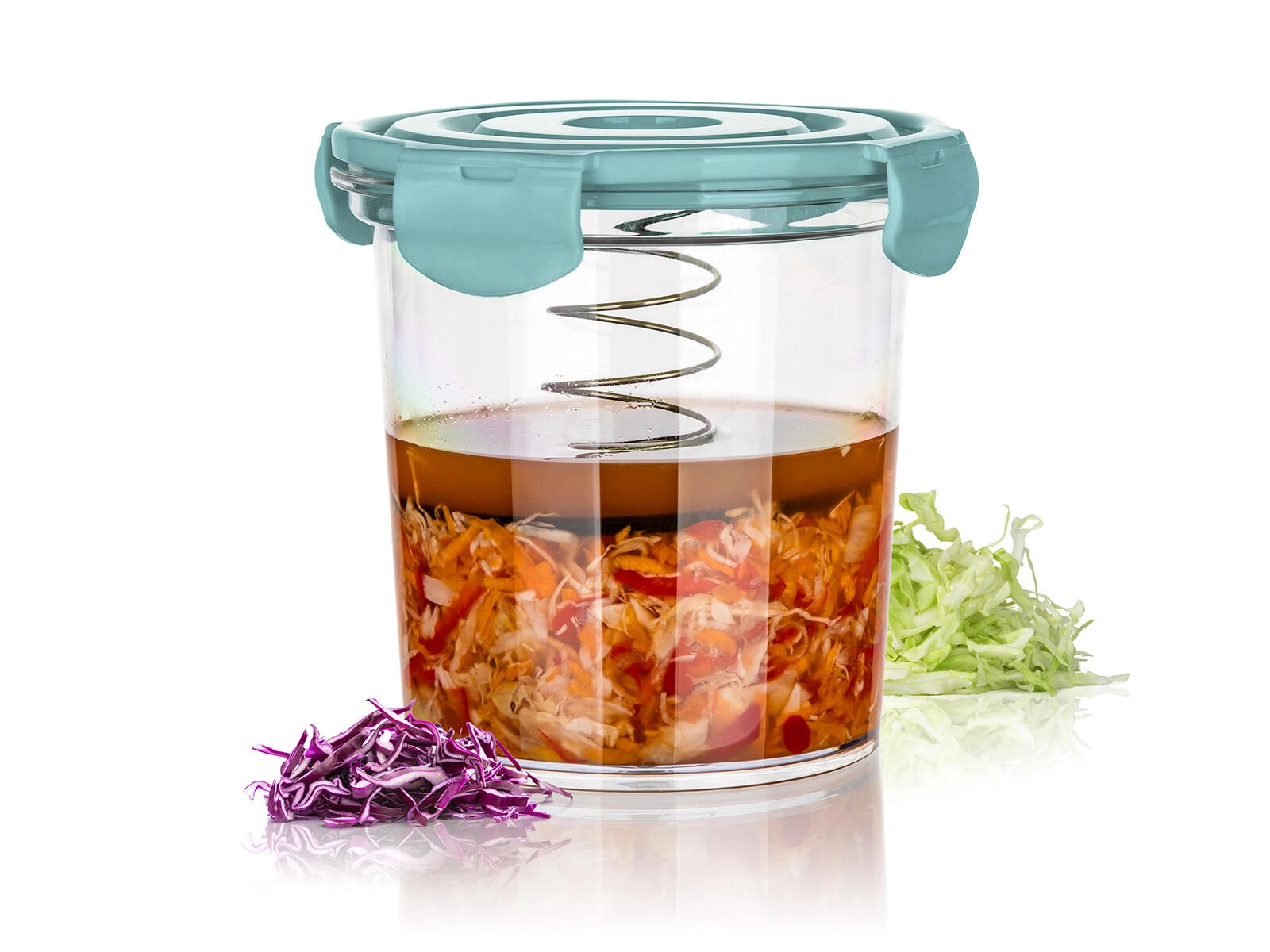 - Sprężynowa pokrywka z klipsami – utrzymuje zawartość zanurzoną i bez dostępu powietrza.